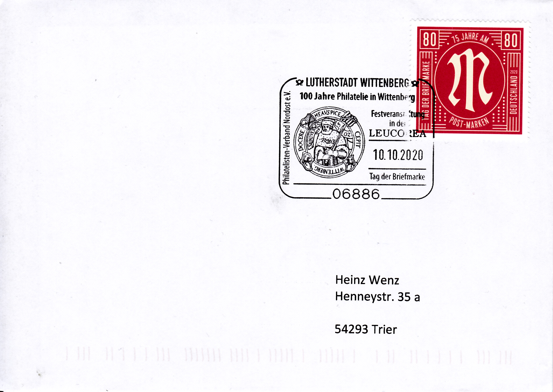 Am 10.10.2020 wurde in Wittenberg ein Sonderstempel des Philatelisten-Verband Nordost e.V. zum Tag der Briefmarke 2020 eingesetzt.