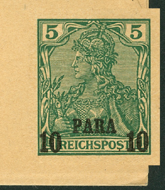 Der Wertstempel (10 Para auf 5 Pfennig, grün).