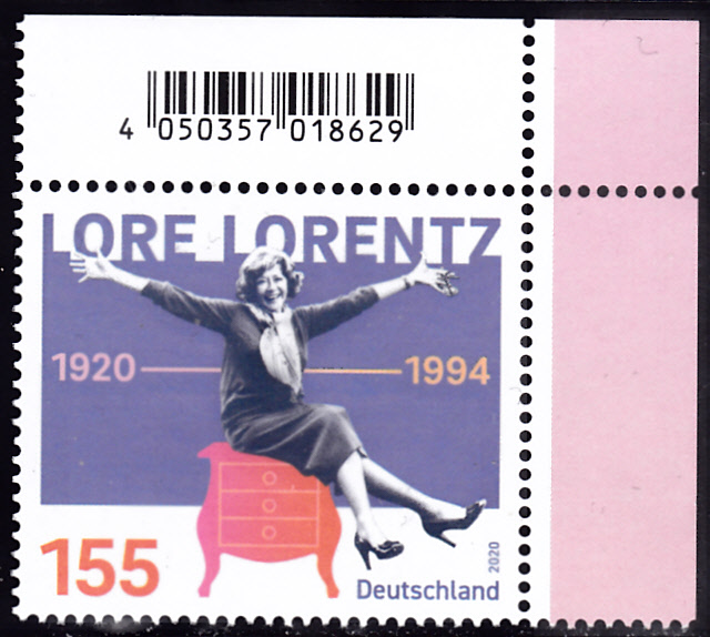 Zum 100. Geburtstag von Lore Lorentz erschien bei der Deutschen Post eine Marke (MiNr 3565, die Lore Lorentz auf einer Kommode sitzend abbildet. Hier zeige ich ein Eckrandstück der Marke mit EAN-Codierung.
