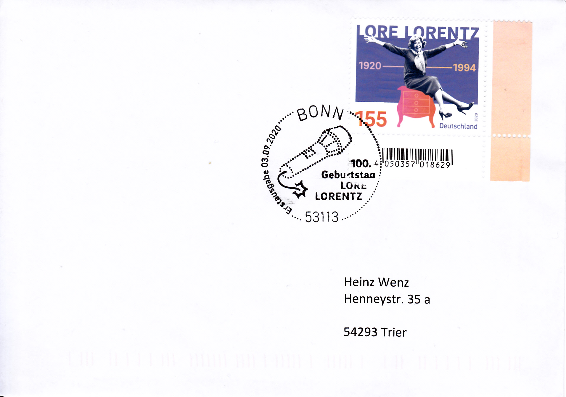 Brief mit der Marke zum 100. Geburtstag von Lore Lorentz mit dem Ersttagsonderstempel Bonn.