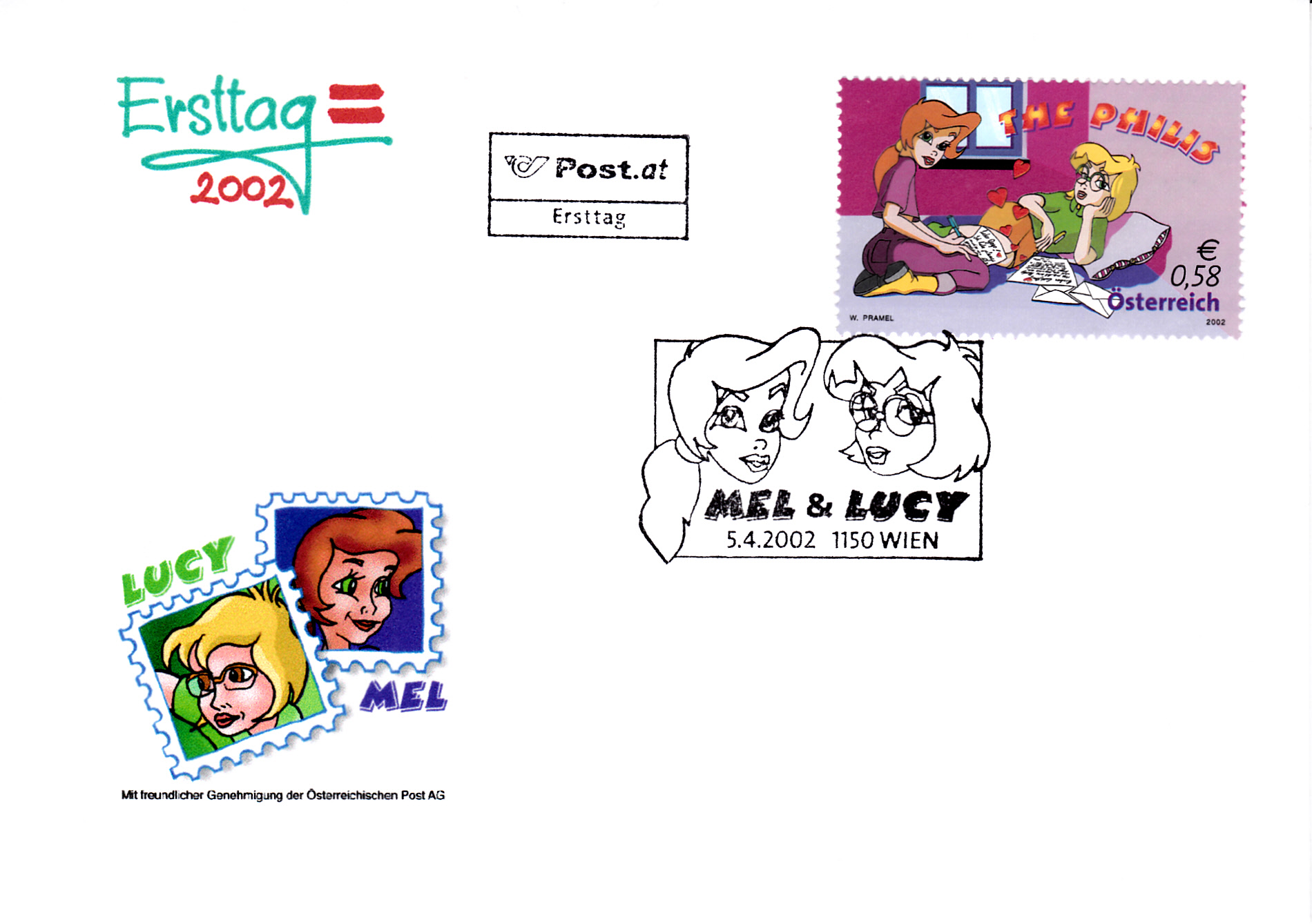Bei der Post in Österreich erschienen dazu Briefmarken. Hier eine Marke (MiNr 2372) die Mel und Lucy beim Briefeschreiben zeigt.