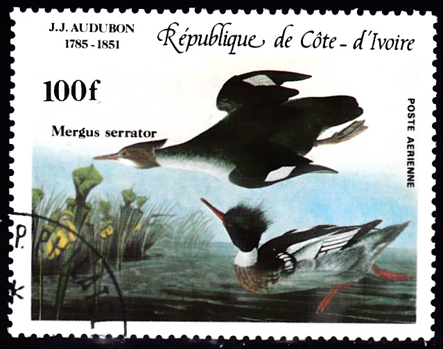 Die Vögel Amerikas (Birds of America) umfasst 435 handcolorierte Bildtafeln mit der Darstellung von mehr als 1.000 Exemplaren. Zum 200. Geburtstag von John James Audubon ist in der Elfenbeinküste in einer Serie diese Marke (MiNr 853) mit der Zeichnung "Mittelsäger (Mergus serrator)" von John James Audubon.