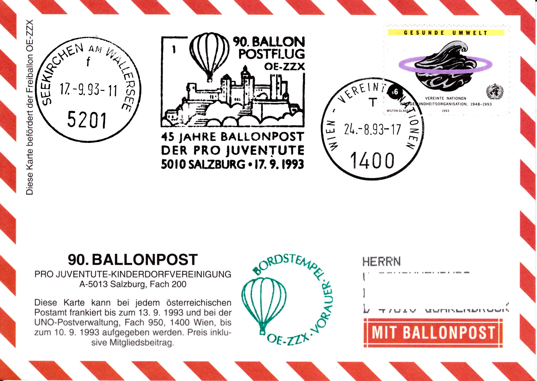 Diese Karte wurde am 17.9.1993 in Salzburg für den 90. Ballonpostflug der Österreichischen Pro Juventute mit dem Freiballon OE-ZZX aufgegeben. Sie erhielt den Sonderstempel mit der Kennziffer "1" aus Salzburg zu diesem Ballonflug und wurde am gleichen Tag mit dem Freiballon OE-ZZX befördert. Sie erhielt zusätzlich einen Tagesstempel Seekirchen am Wallersee und einen Bordstempel.