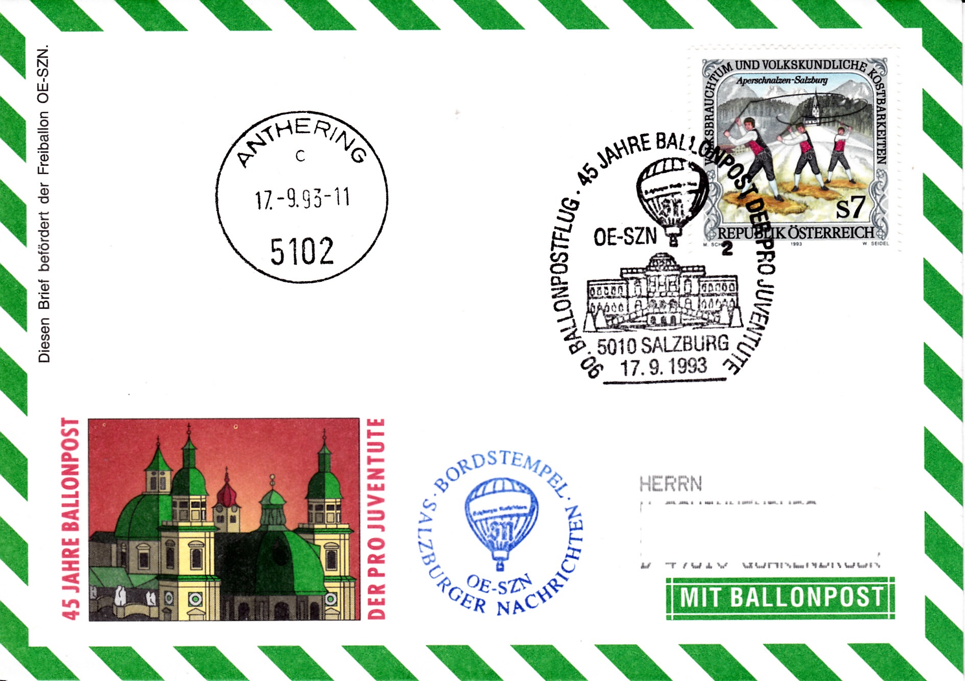 Dieser Brief wurde am 17.9.1993 in Salzburg für den 90. Ballonpostflug der Österreichischen Pro Juventute mit dem Freiballon OE-SZN aufgegeben. Er erhielt den Sonderstempel mit der Kennziffer "2" aus Salzburg zu diesem Ballonflug und wurde am gleichen Tag mit dem Freiballon OE-SZN befördert. Er erhielt zusätzlich einen Tagesstempel Anthering und einen Bordstempel.