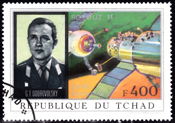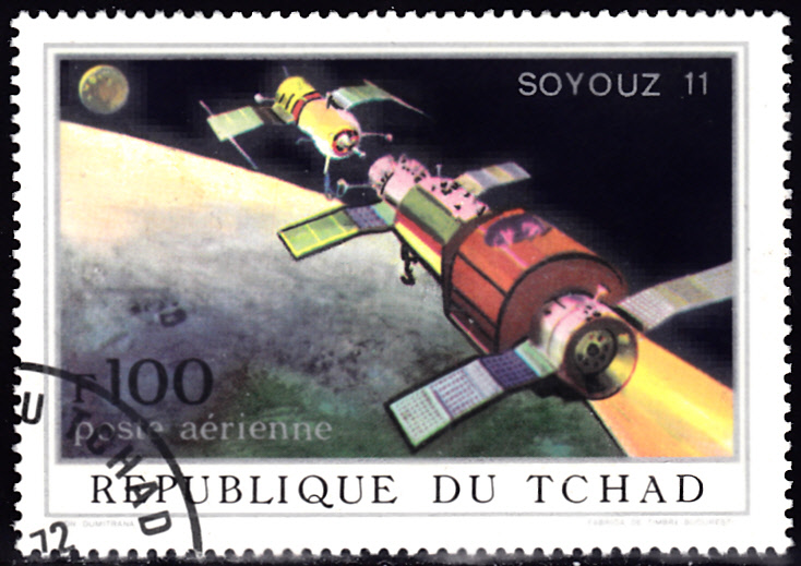Zum Start von Sojus 11 ist im Tschad in einer Serie "Sojus 11" diese Marke (MiNr 450 A) erschienen. Sie zeigt die Raketenstartrampe für Sojus 11.