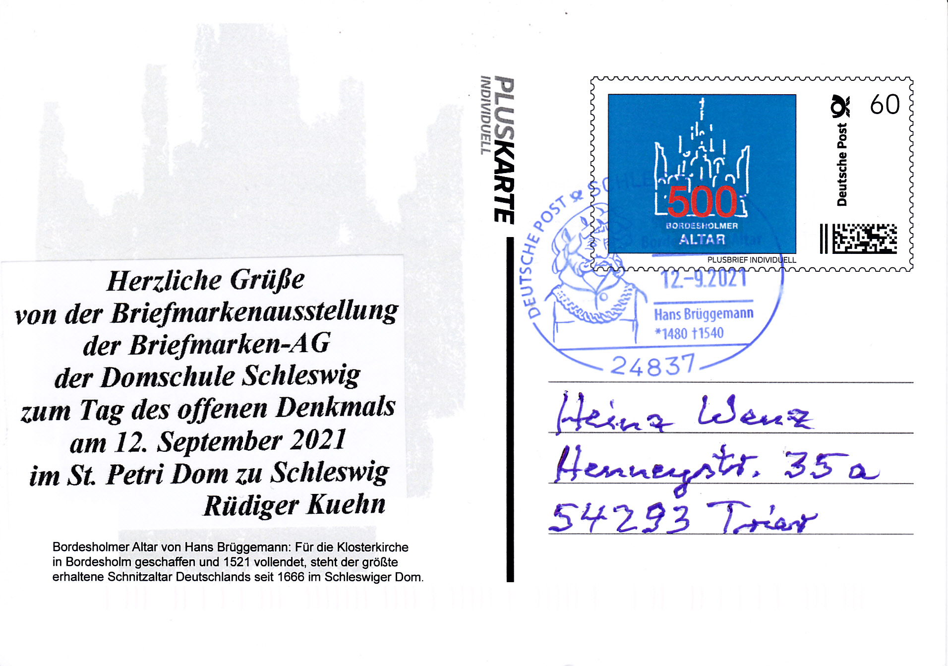 Pluskarte individuell mit passendem Sonderstempel vom 30.6.2019 aus Dannewerk mit einer Ansicht der mittelalterlichen Befestigung bei Danewerk und Haithabu im Wertstempel und im Sonderstempel.