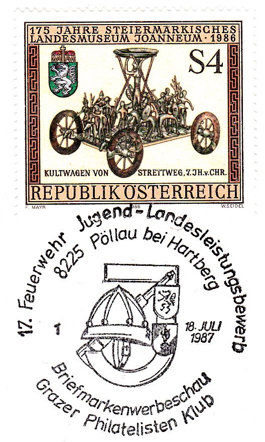 Sonderstempel vom 18.7.1987 aus A-8225 Pöllau bei Hartberg zu einer Briefmarkenschau bei einem Jugend-Landesleistungsbewerb der Feuerwehr. Der Sonderstempel hat die Kennziffer "1"