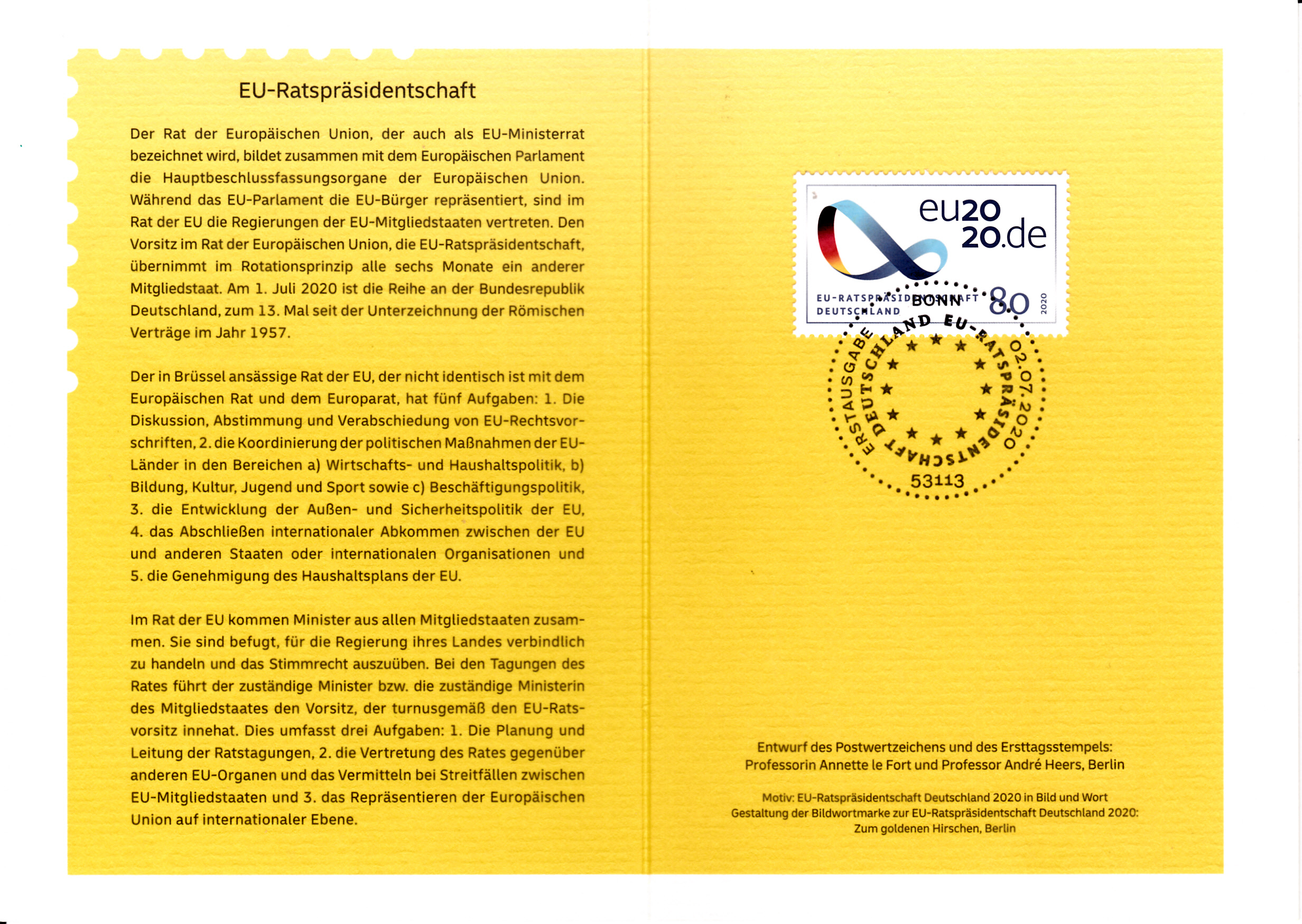 Klappkarte des Vorstandsvorsitzenden der Deutschen Post AG mit einer Marke zum Vorsitz Deutschlands im Rat der Europäischen Union (MiNr 3554) und dem Ersttagsonderstempel Bonn.