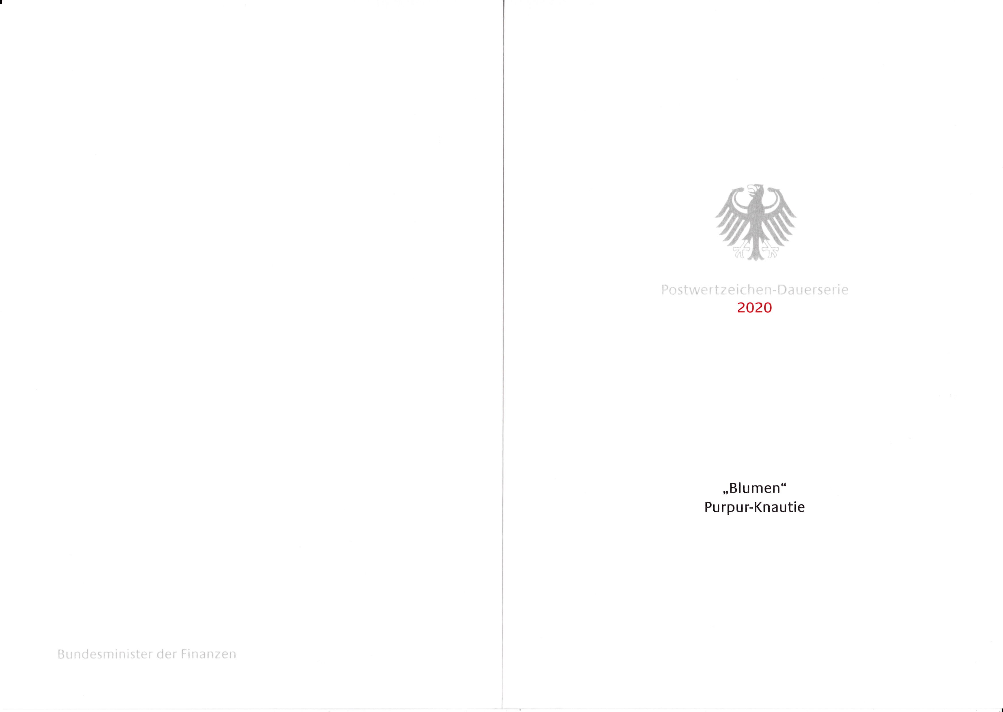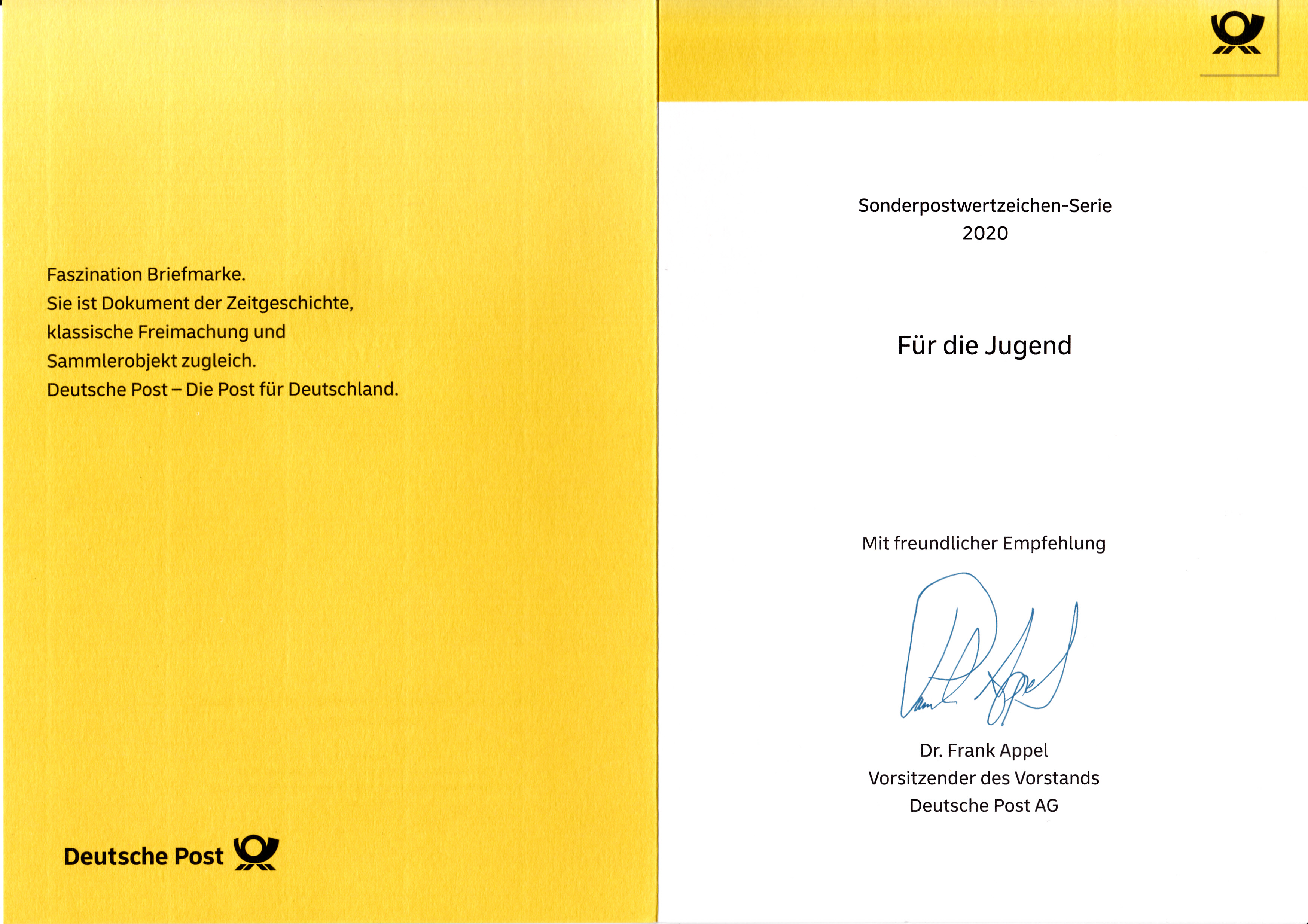 Zur Markenübergabe der Jugendmarke 2020 wurde diese farbige Ministerkarte des Finanzministers hergestellt. Sie enthält einen Satz der Jugendmarken 2020. Zwei Marken sind mit dem Ersttagsonderstempel aus Berlin und eine mit dem aus Bonn gestempelt.