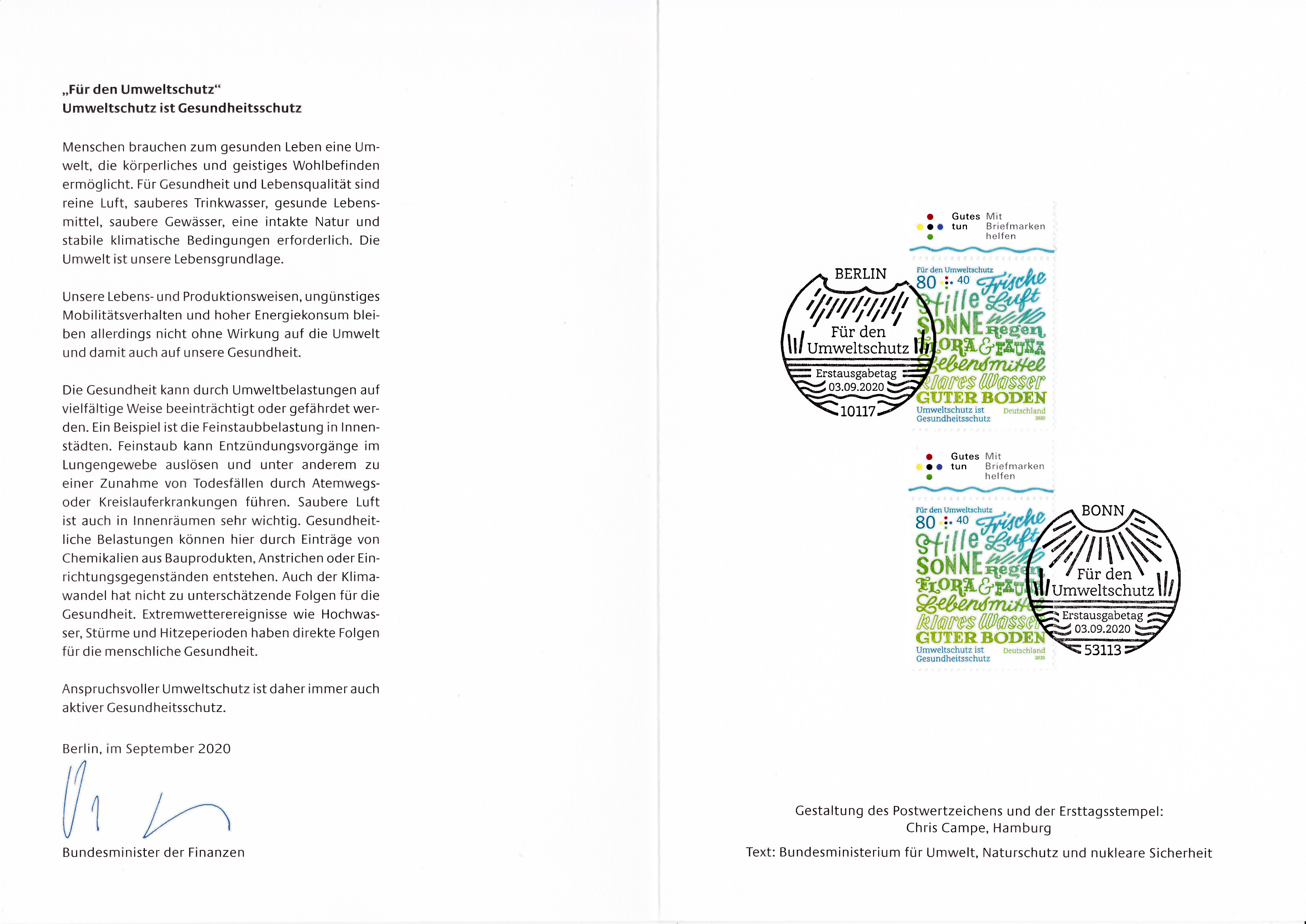 Ministerkarte des Finanzministers mit zwei Marken zum Umweltschutz: Umweltschutz ist Gesundheitsschutz (MiNr 3561) und den beiden Ersttagsonderstempel Bonn und Berlin.