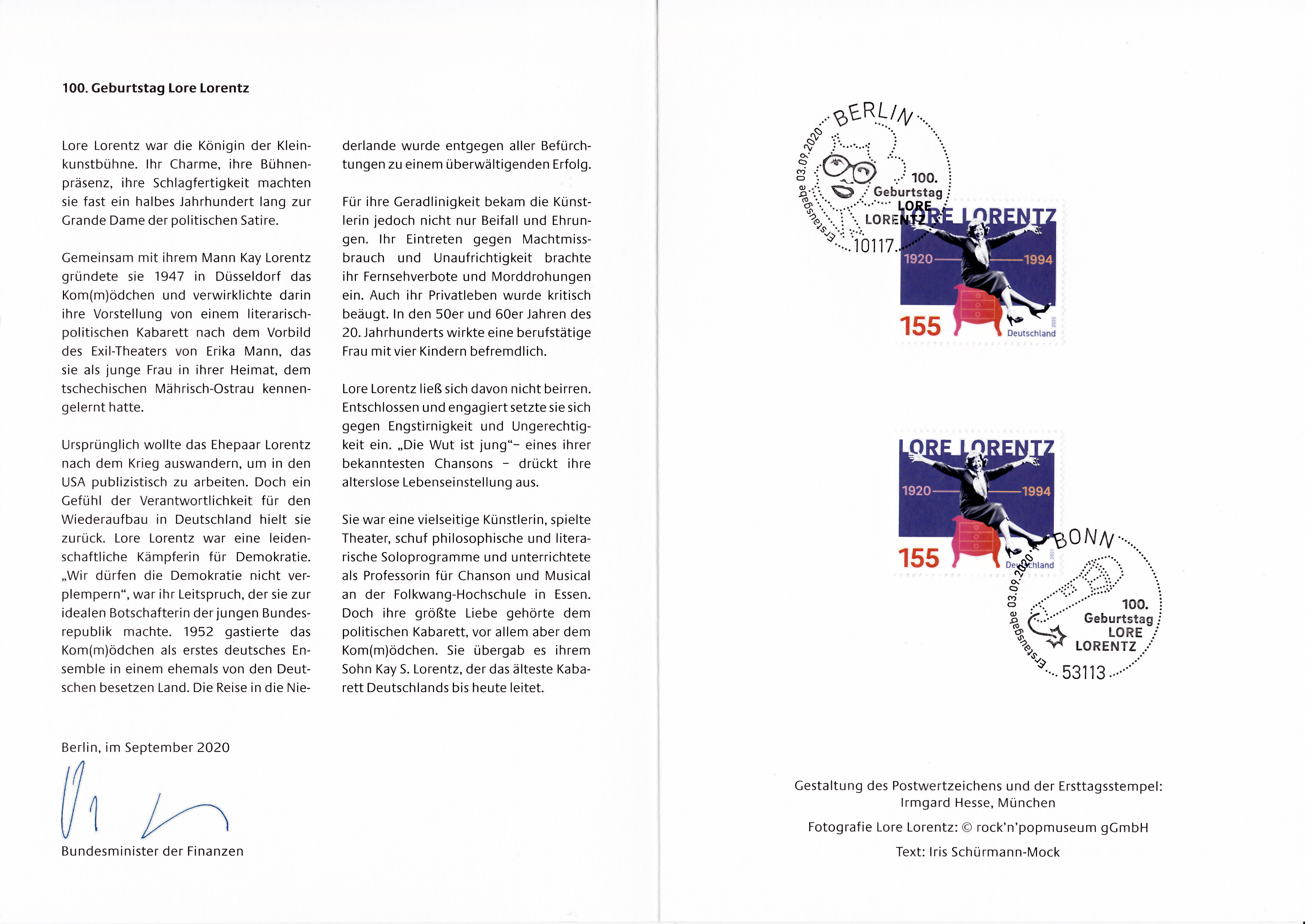 Ministerkarte des Finanzministers mit zwei Marken zum 100. Geburtstag von Lore Lorentz (MiNr 3565) und den beiden Ersttagsonderstempel Bonn und Berlin.