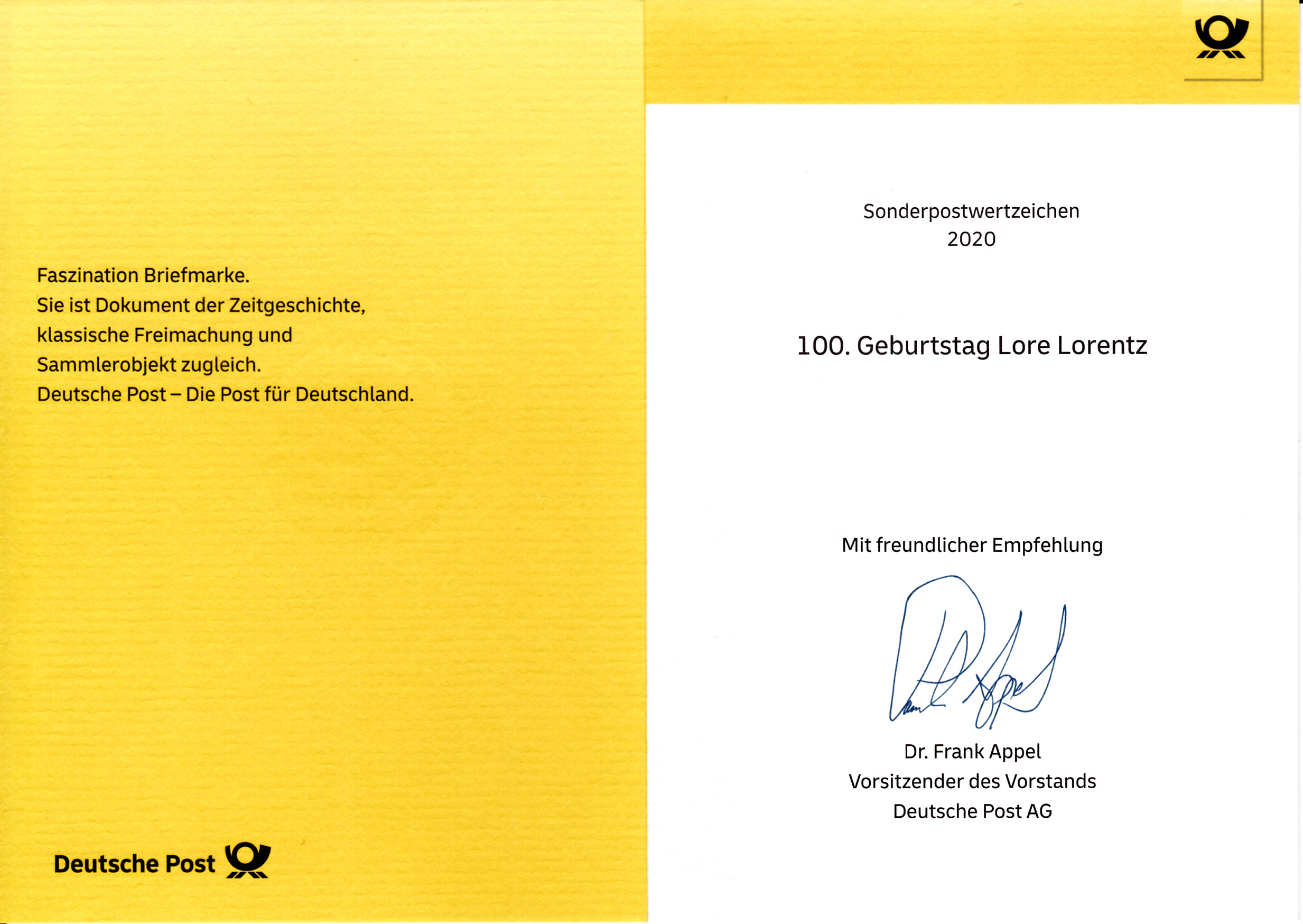 Klappkarte des Vorstandsvorsitzenden der Deutschen Post AG mit einer Marke zum 100. Geburtstag von Lore Lorentz (MiNr 3565) und dem Ersttagsonderstempel Bonn.