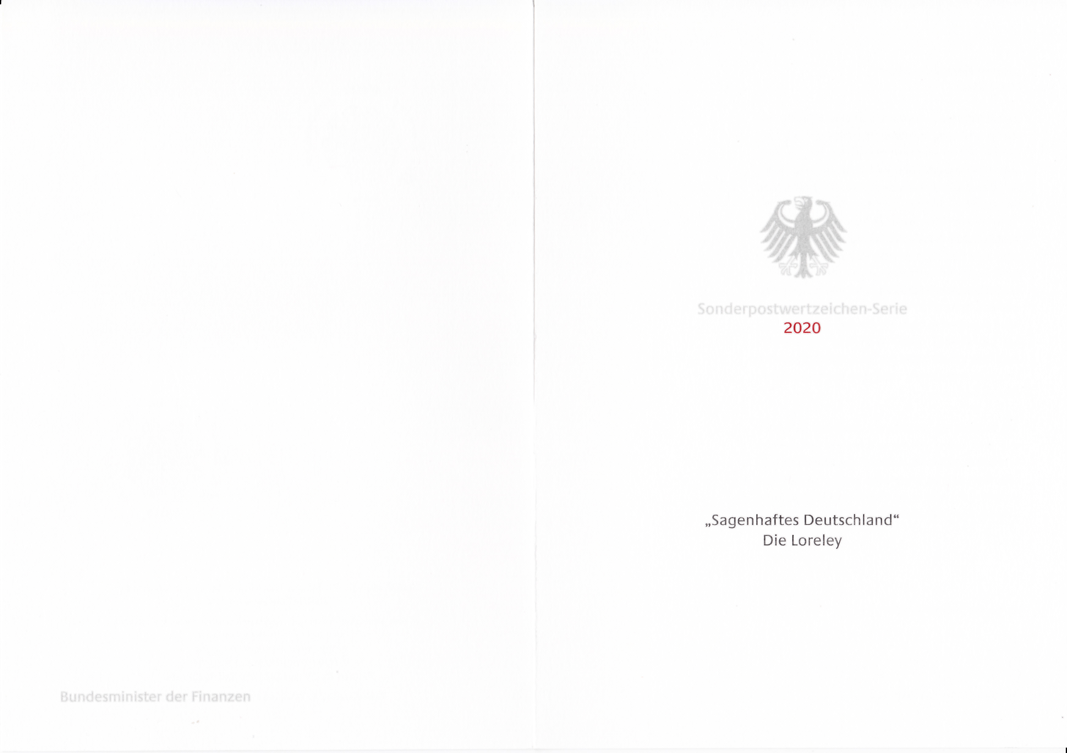 Ministerkarte des Finanzministers mit zwei Marken aus der Serie "Sagenhaftes Deutschland" (MiNr 3567) mit dem Motive "Loreley, auf Burg Rheinstein in das Flusstal blickend" und mit den Ersttagsonderstempel Berlin und Bonn gestempelt.