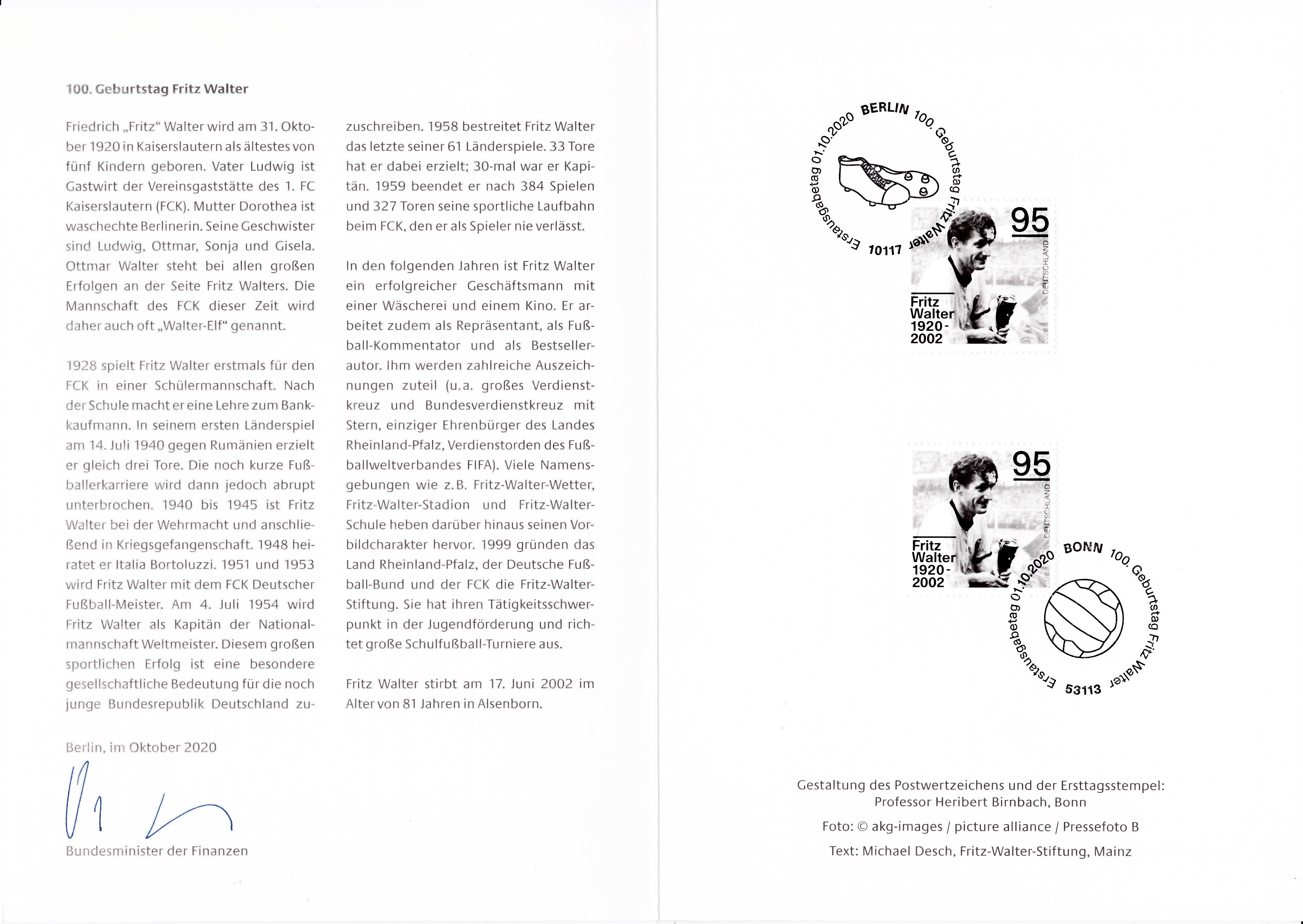Ministerkarte des Finanzministers mit zwei Marken zum 100. Geburtstag von Fritz Walter (MiNr 3568) und den Ersttagsonderstempel Berlin und Bonn gestempelt.