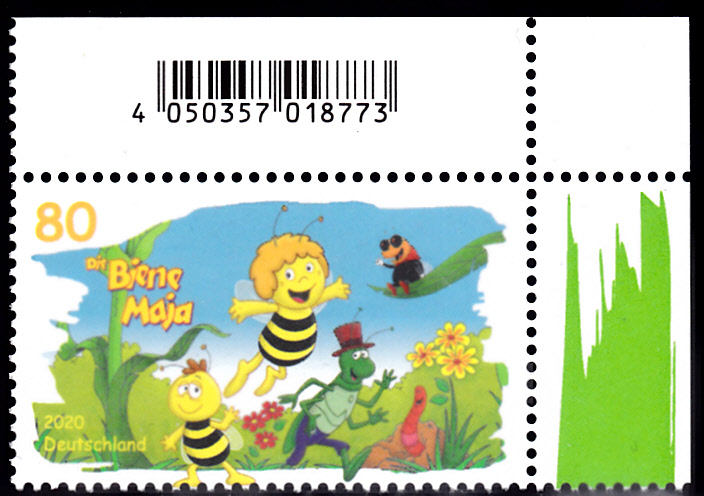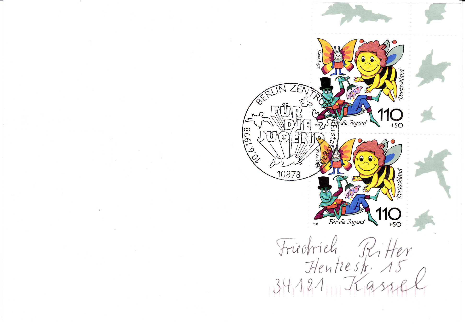 In der Jugendmarkenserie 1998 war auf einer der beiden Marken zu 110+50 Pfennig (MiNr 1992) auch die Biene Maja zu sehen. Hier ein senkrechtes Paar vom rechten oberen Bogenrand dieser Marke auf einem Ersttagsbrief von 21 bis 50 g mit Ersttagsstempel Berlin.