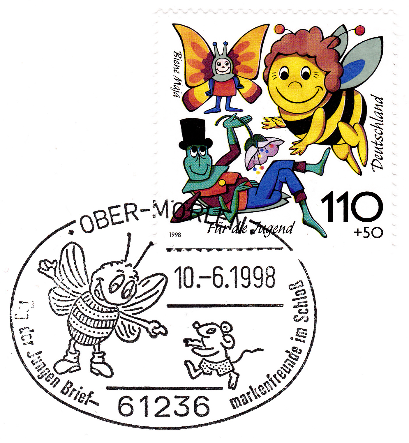 Zu dieser Jugendmarke mit der Biene Maja gab es am 10.6.1998, am Ausgabetag der Marke, in Ober-Mörlen einen zum Motiv der Marke passenden Sonderstempel zum Tag der Jungen Briefmarkenfreunde.