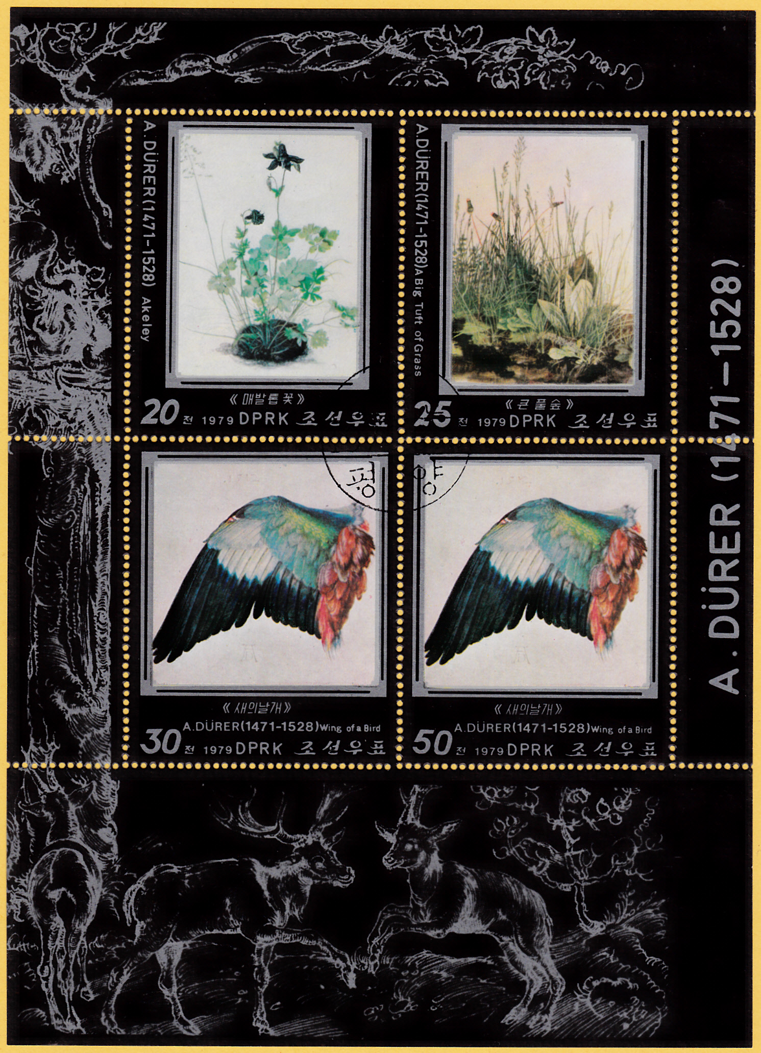Hier zeige ich noch eine dritte Marke aus Nord-Korea (MiNr 1856) mit dem "Flügel der Nebelkrähe" von Albrecht Dürer.