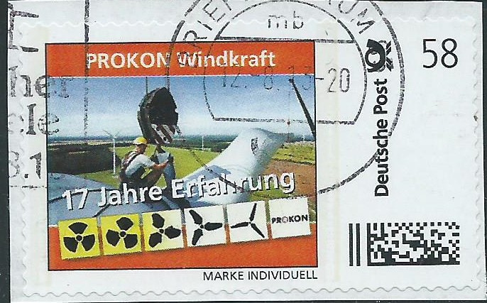 Und dann gab es noch die Firma Prokon, die gerade aktuell in der Insolvenz steckt. Das ist ein Windenergieunternehmen hier aus dem Norden, genauer aus Itzehoe. Durch die Insolvenz haben viele Geldanleger ihre Einlagen verloren. Zu besseren Zeiten gab es sogar eigene Firmenmarken zu 58 ct mit mir bislang 2 vorliegenden Motiven: