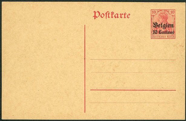 Die unter anderem mit der Postkarte P 1 im Jahr 1914 für die Landespost in Belgien ihren Anfang nahm. Der anfängliche Aufdruck lautete in "Centimes".
