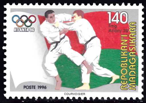 Bereits 1994 ist in Madagaskar eine Markenserie zu den Spielen 1996 erschienen. Diese Marke (MiNr 1649 A) hat einen Dressurreiter als Motiv.