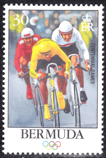 Eine Marke der Serie aus Bermuda (MiNr 692) bildet Radrennfahrer beim Straßenrennen ab.