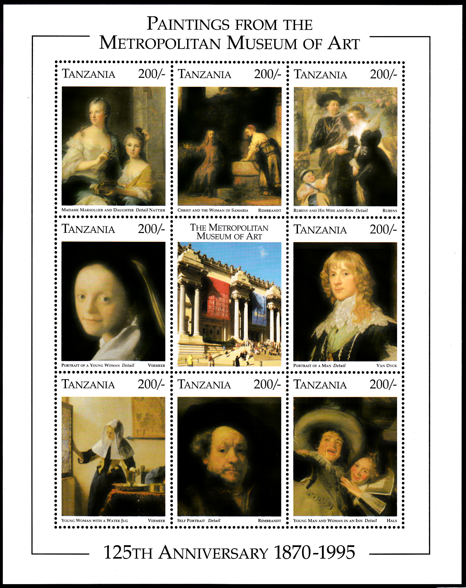 Aus einer Serie "125 Jahre Metropolitan Museum of Art, New York" aus Tansania stammt diese Marke (MiNr 2323) mit einem Ausschnitt aus dem Gemälde "Porträt eines jungen Mädchens" von Jan Vermeer.