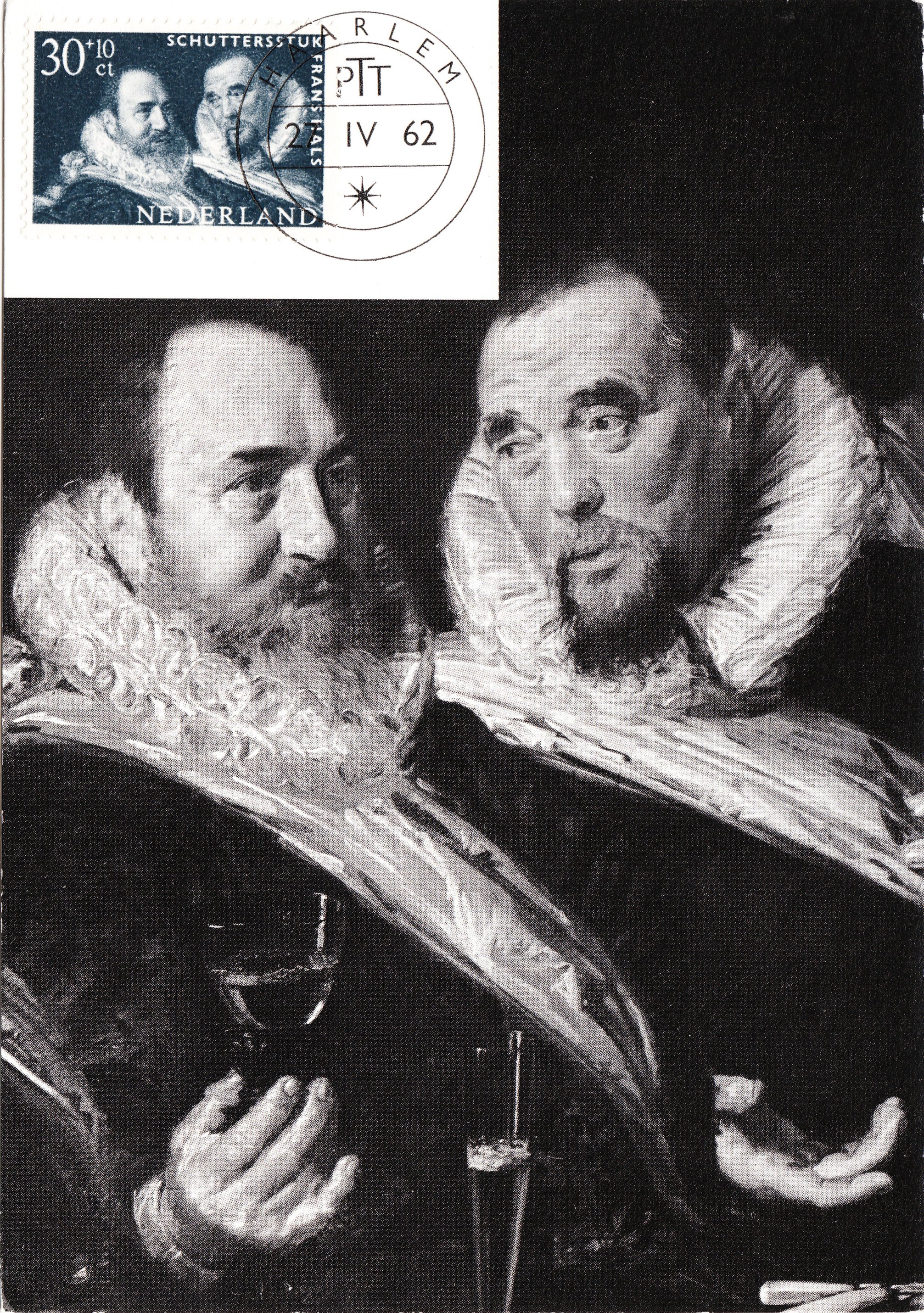 Dieses Postwertzeichen aus den Niederlanden zeigt einen Ausschnitt aus dem Gemälde "Schuttersstuk" von Frans Hals. Die dazu aufgelegte Maximumkarte zeigt einen etwas größeren Ausschnitt aus diesem Gemälde: