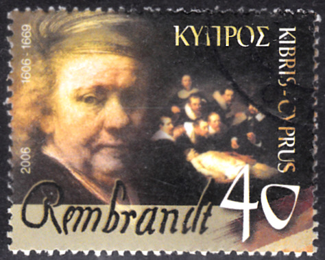 Zum 400. Geburtstag von Rembrandt erschien auf Zypern dieser Marke (MiNr 1070 mit einem Selbstbildnis und dem Gemälde "Die Anatomiestunde des Dr. Tulp" von Rembrandt.