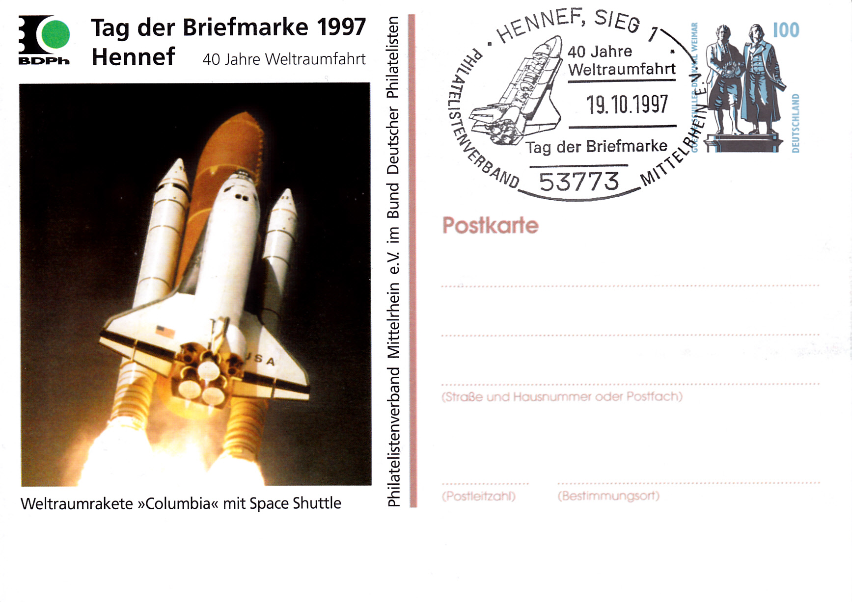 Der Philatelistenverband Mittelrhein e.V. zeigt auf der Ganzsachenkarte die Weltraumrakete "Columbus" mit Space Shuttle und im Sonderstempel vom 19.10.1997 aus Hennef ein Space Shuttle.