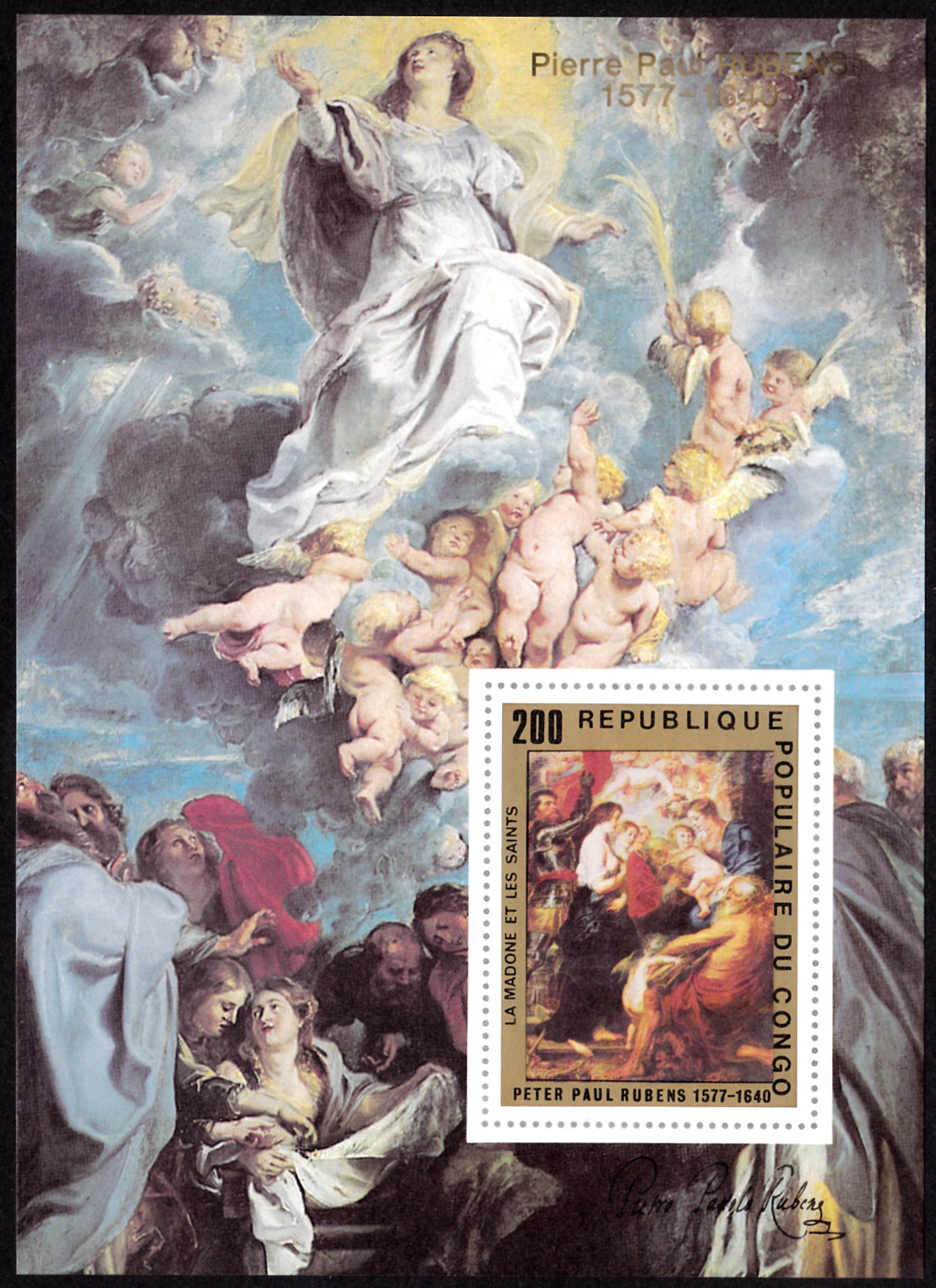 Im Niger erschienen zum 400. Geburtstag von Peter Paul Rubens außer dem bereits auf der ersten Seite hier schon gezeigten Block auch noch eine Serie mit fünf Märken. Eine Marke zu 50Fr (MiNr 607) zeigt das Gemälde "Mariä Himmelfahrt" von Rubens.