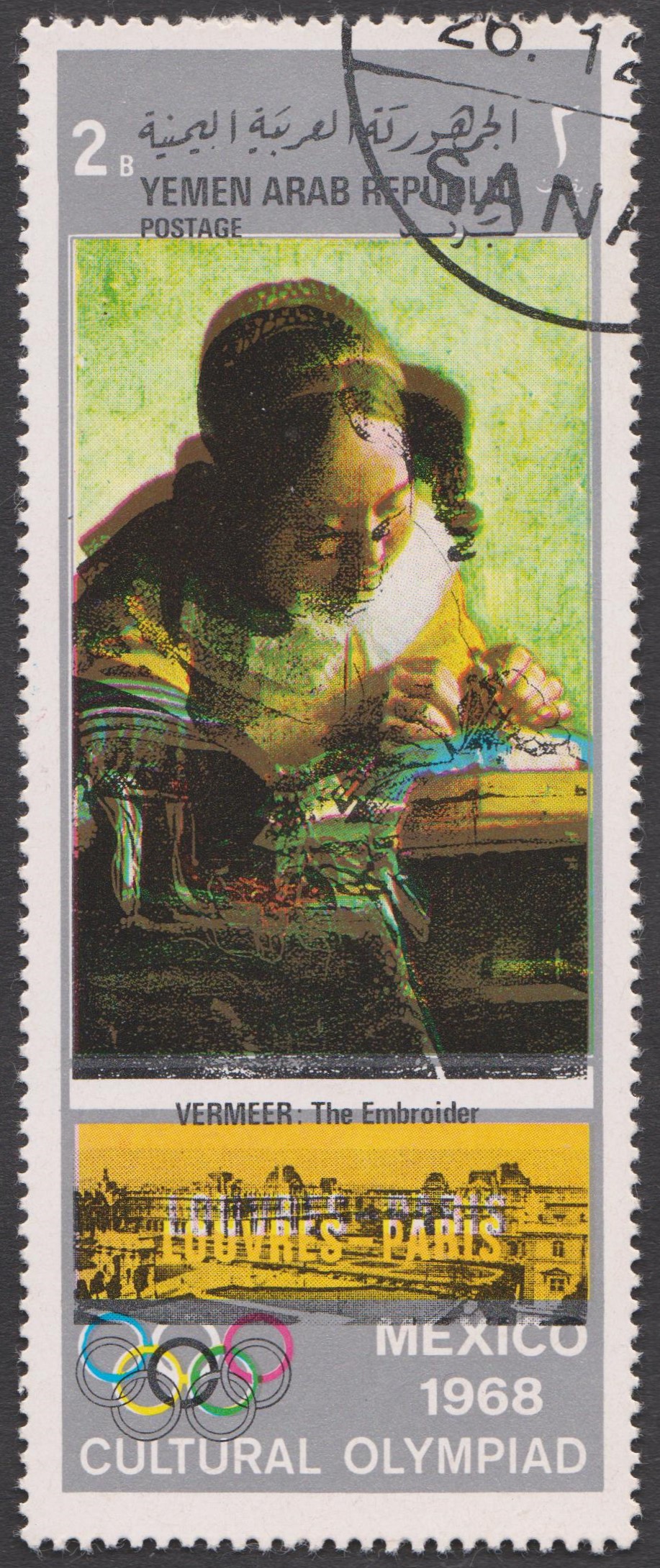 Für diese zur Olympiade 1968 in Mexiko erschienenen Marke aus dem Jemen, MiNr. 865, wurde ein Ausschnitt aus dem Gemälde "Die Spitzenklöpplerin" von Jan Vermeer als Hauptmotiv gewählt: