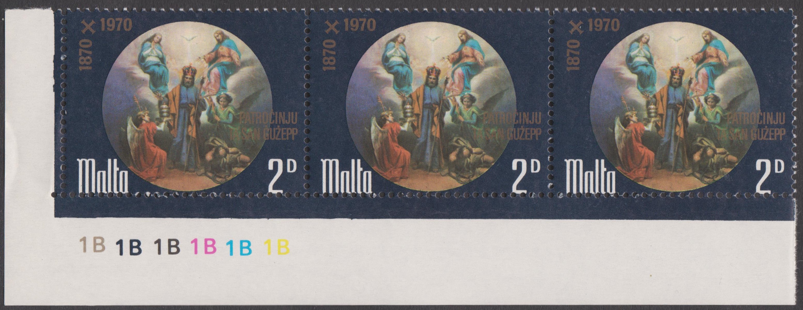 Hier die Ausgabe Malta MiNr. 425 im waagerechten Dreierstreifen aus der unteren linken Bogeneck mit einzelnen Druckvermerken der 5 verschiedenen Druckfarben: