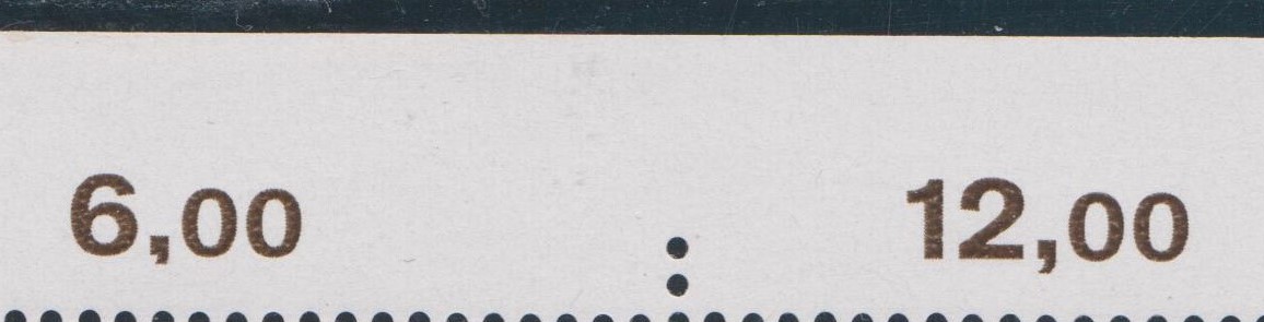 Beim Komma des Reihenwertzählers "6,00" in der linken oberen Bogenecke liegt als Plattenfehler ein verkürztes Komma vor: