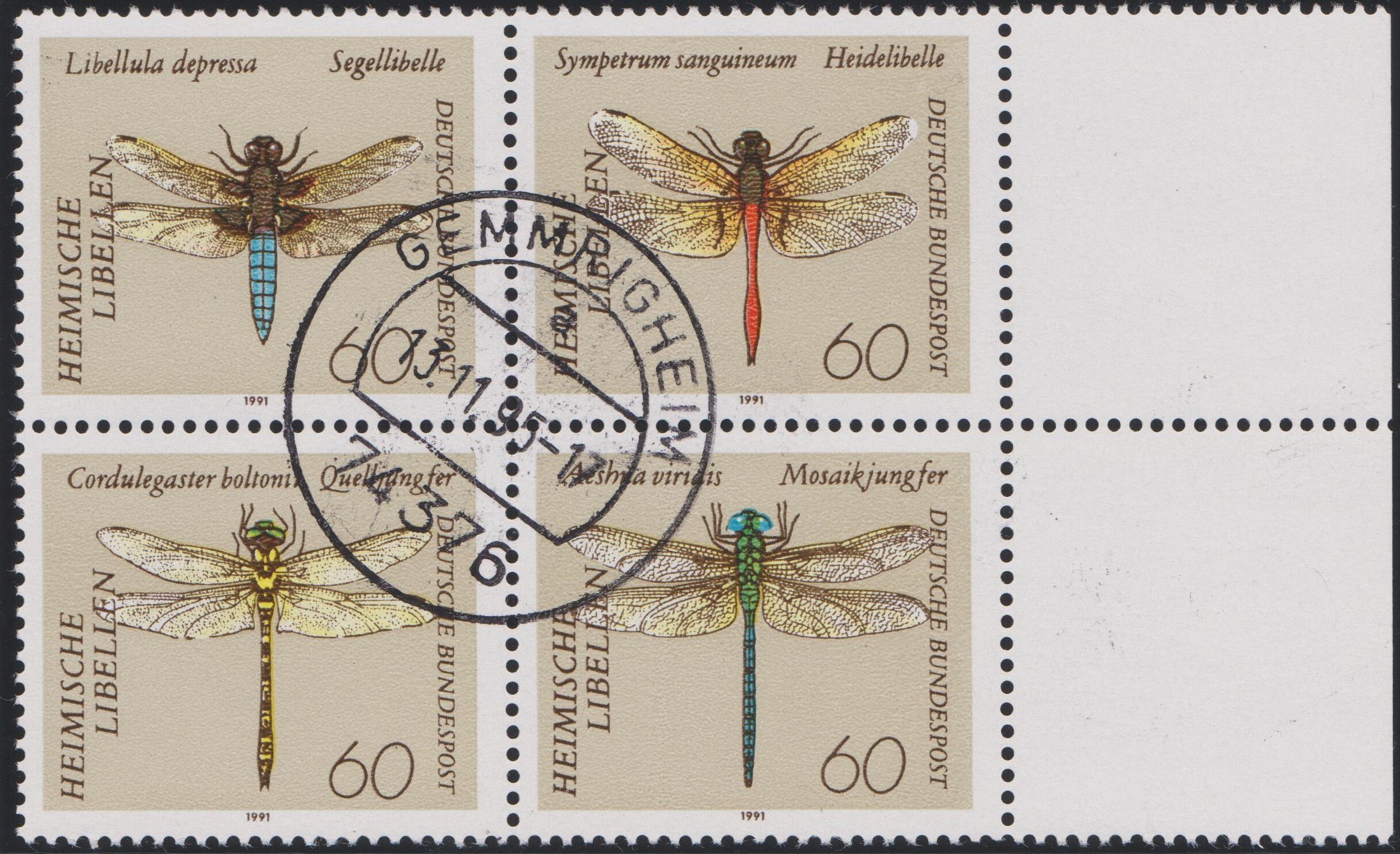 Es ist ein Viererblock der BUND MiNr. 1583 y enthalten, gedruckt auf Papier mit Fluoreszenz, entwertet am 09.01.1991 per Ersttagsstempel!