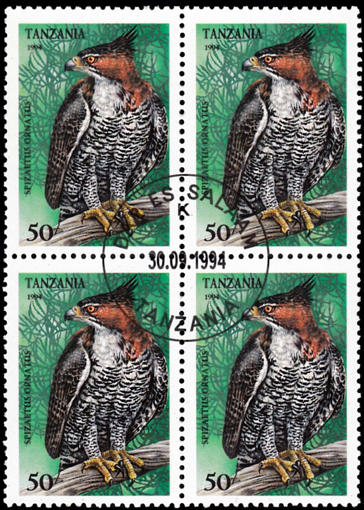 Aus einer Serie "Raubvögel" kommt eine Marke aus Tansania (MiNr 1855) mit einem Prachthaubenadler (Spizaetus ornatus). Hier zeige ich einen Viererblock dieser Marke.