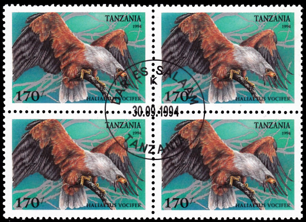 Aus einer Serie "Raubvögel" kommt eine Marke aus Tansania (MiNr 1858) mit einem Schreiseeadler (Halaeetus vocifer). Hier zeige ich einen Viererblock dieser Marke.