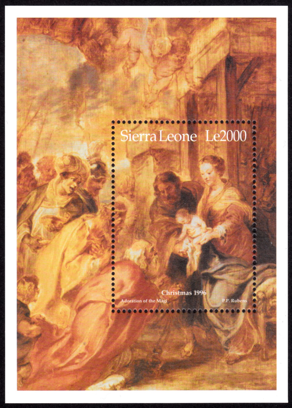 Zur gleichen Weihnachtsausgabe gehört auch dieser Block aus Sierra Leona (MiNr Block 311 mit Marke MiNr 2702) mit dem Gemälde "Anbetung der Könige" von Peter Paul Rubens.