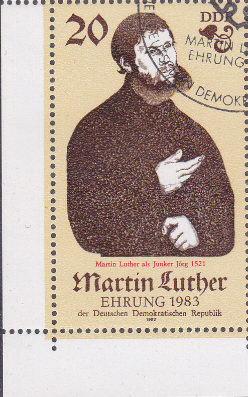 Bei der hier bereits früher gezeigten Marke zu 20Pf aus der DDR (MiNr 2755) mit Martin Luther als Junker Jörg nach einem Gemälde von Lucas Cranach d. Ä. gibt es im Kleinbogen Plattenfehler.
