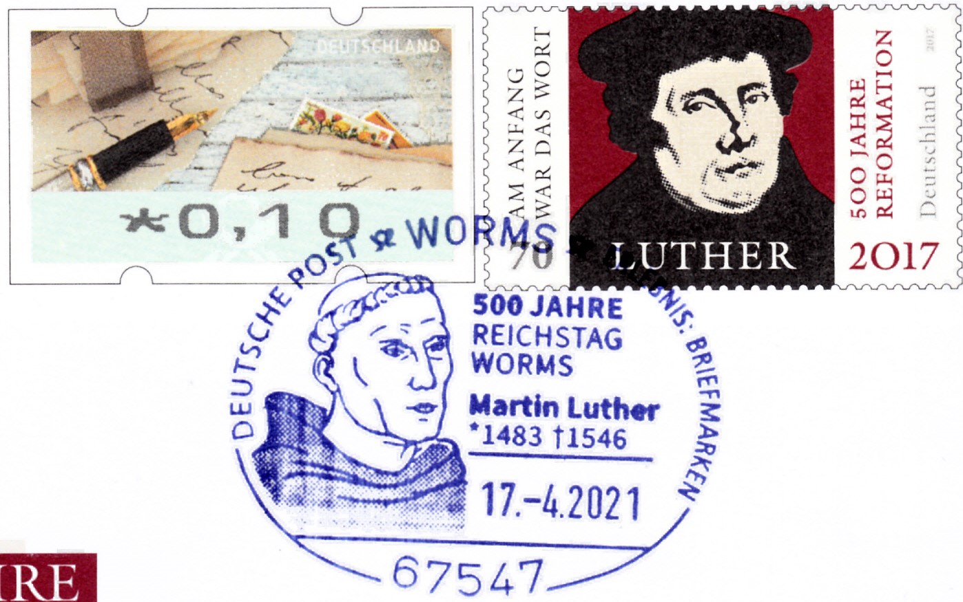Dieser Umschlag wurde am 17.4.2021 mit einem Sonderstempel aus Worms zum Jubiläum "500 Jahre Reichstag Worms" gestempelt. Der Stempel zeigt ein Porträt von Martin Luther.