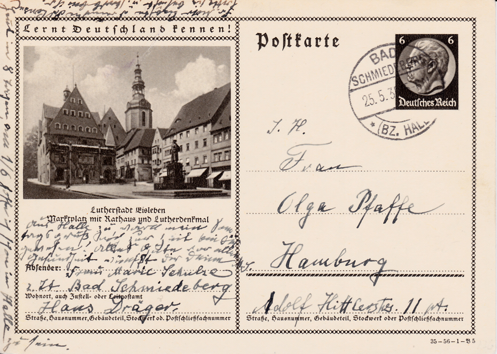 Die Lutherstadt Eisleben wirbt auf dieser Bildpostkarte (MiNr P 236) aus dem Jahre 1935 (Serie 56 Bild 5) mit einem Foto des Marktplatzes mit dem Rathaus und dem Lutherdenkmal.