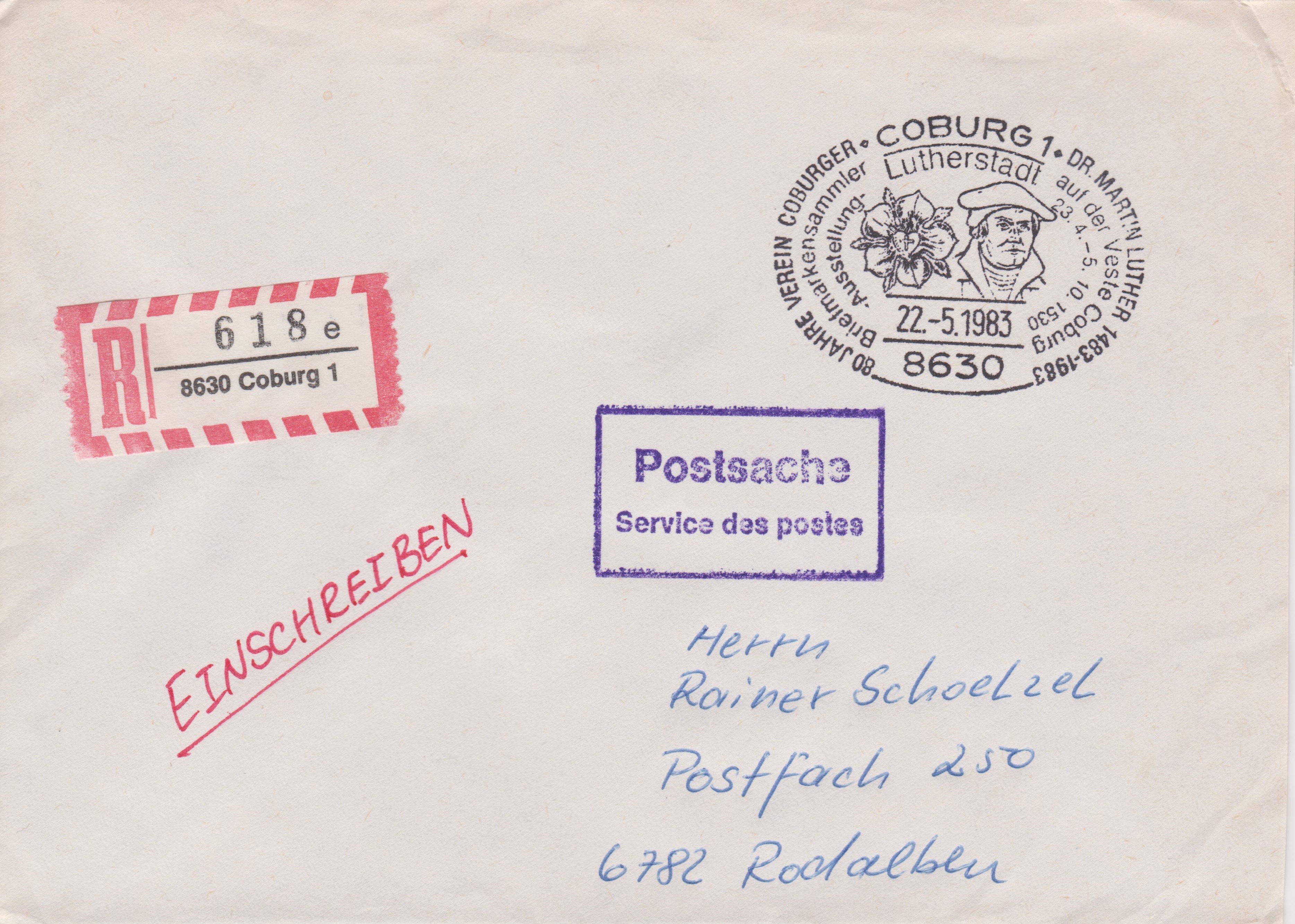 Postsache, adressiert nach "6782 Rodalben", per Einschreiben am 22.05.1983 aufgegeben in 8630 COBURG 1 mit Sonderstempel "Lutherstadt":