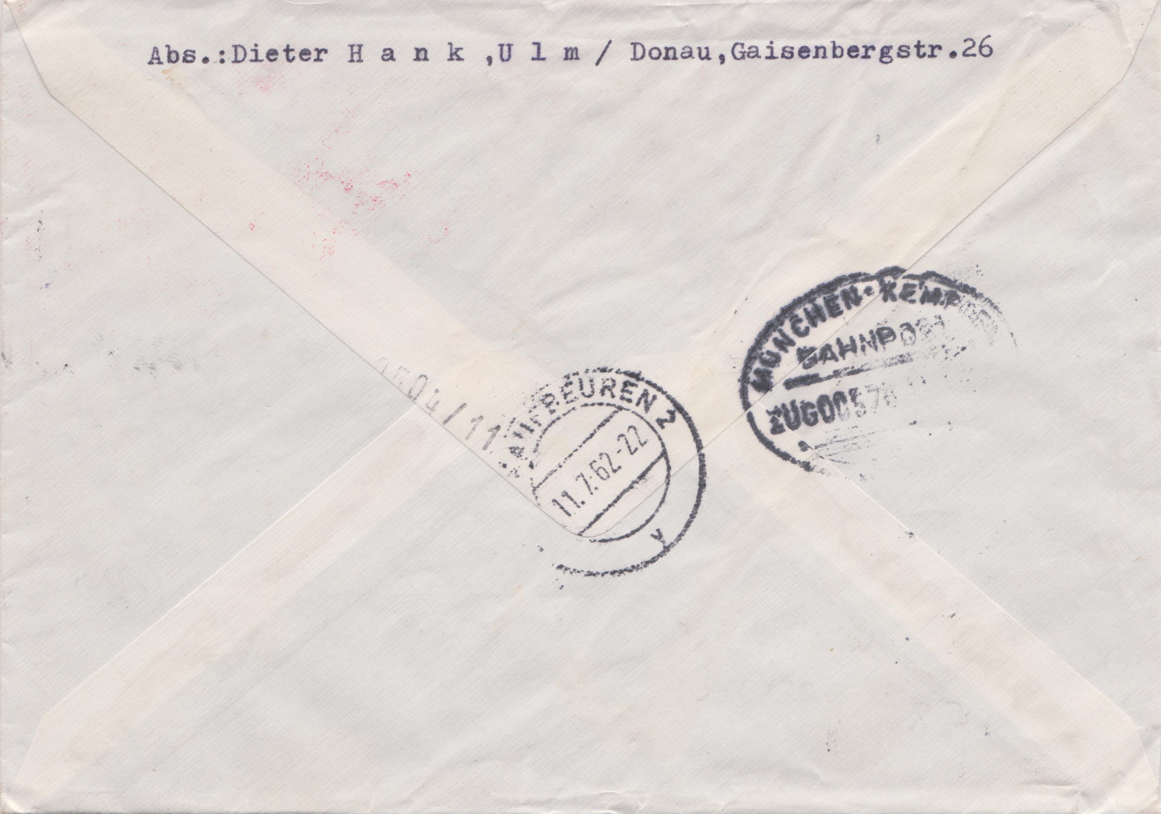 In der Bundesrepublik Deutschland waren die neuen vierstelligen Postleitzahlen am 23.03.1962 eingeführt worden. In der Adresse findet man bereits die neue Postleitzahl für Kaufbeuren "895" (eigentlich 8950, aber die 0 am Ende mußte nicht geschrieben werden!). Bei den Tagesstempelt hatte man die alte Postleitzahl zunächst heraus "aptiert" und benutzte die vorhandenen Stempel ohne Angabe einer Postleitzahl zunächst weiter!