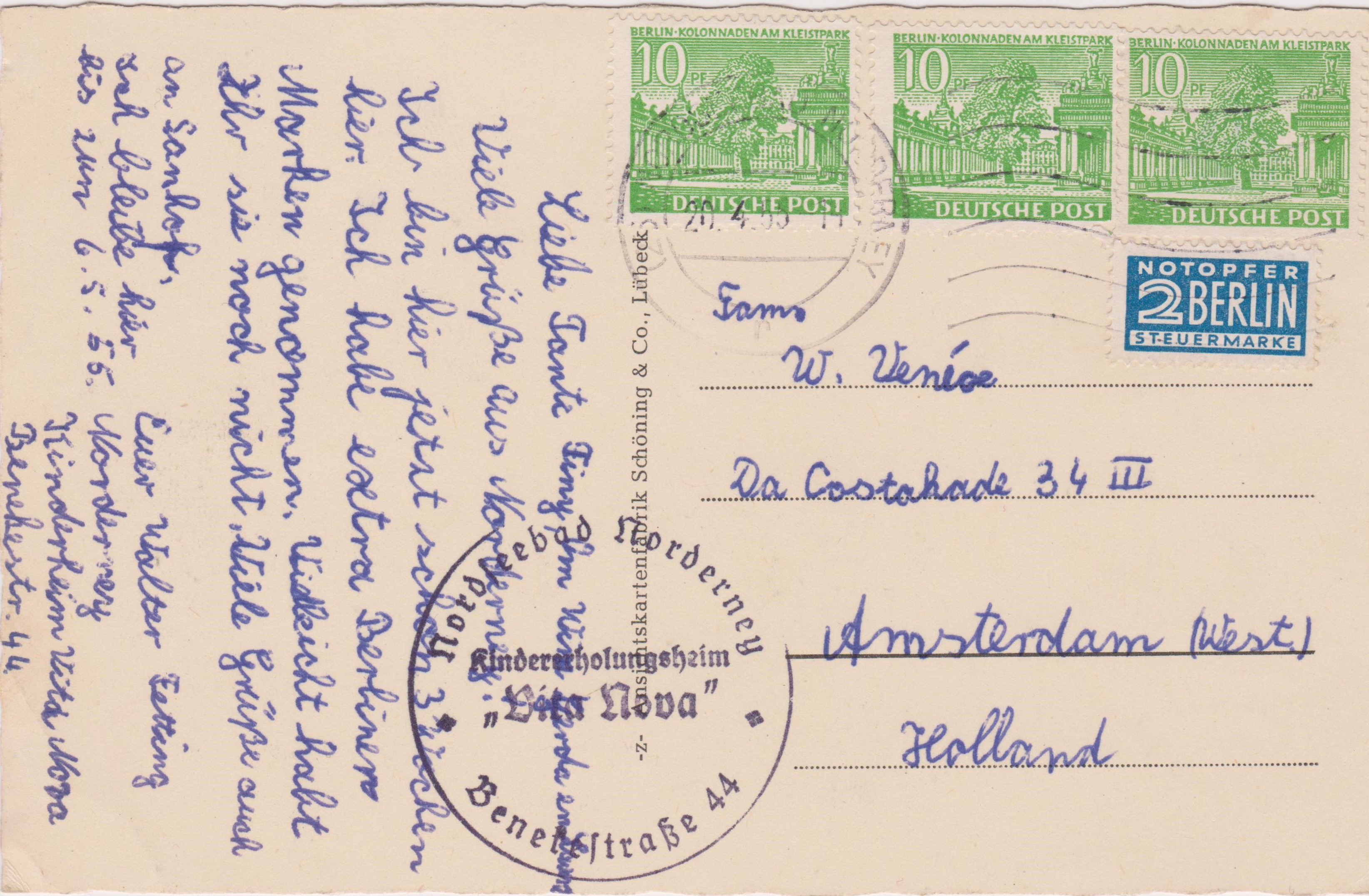 Der Absender war zur Erholung auf Norderney im "Kindererholungsheim Vita Nova", von wo aus er seiner Tante in Holland schrieb "Ich habe extra Berliner Marken genommen. Vielleicht habt ihr sie noch nicht."