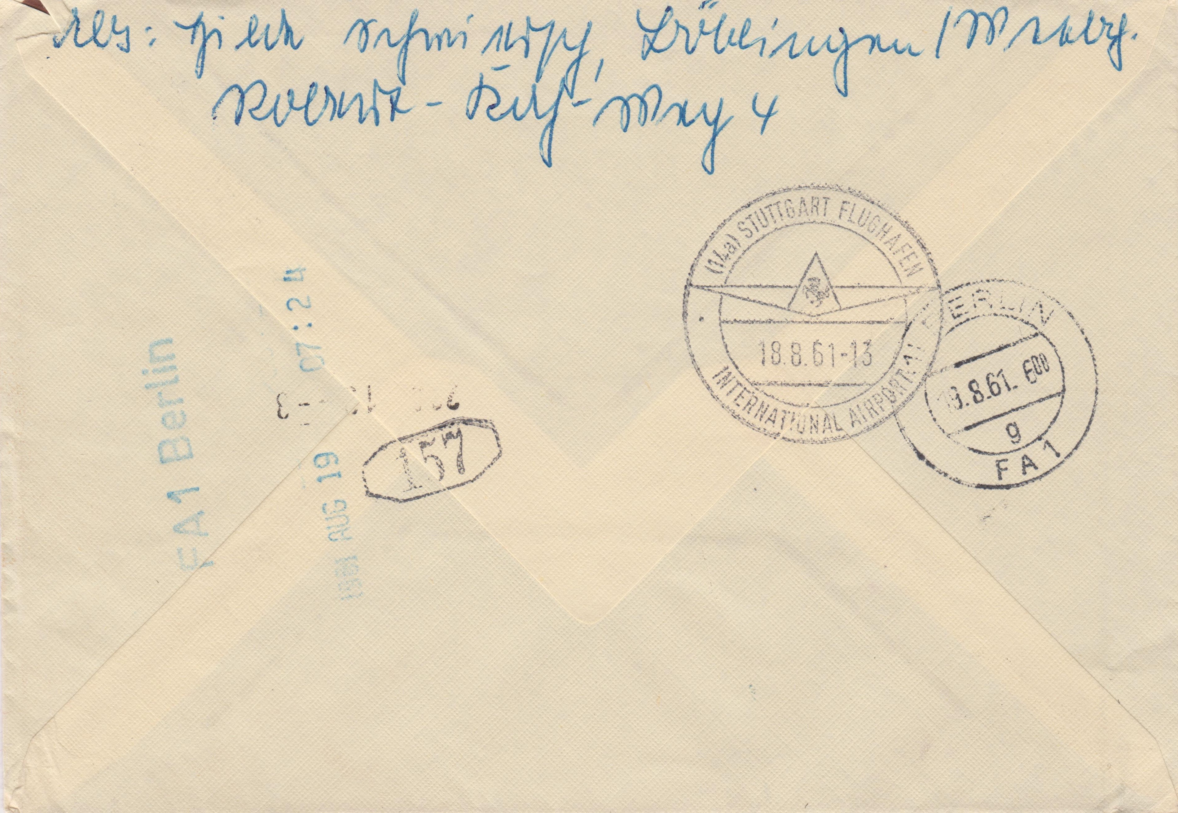 Brief bis 20 g im Fernverkehr, 20 Pf, mit Luftpost, 5 Pf, am 18.08.1961 von Stuttgart nach Berlin, Zustellung am 19.08.1961 per Eilboten, 40 Pf, ergibt die Portostufe 85 Pfennig, hier dargestellt durch Wohlfahrtsmarken, weshalb der Beleg um 2 Pf überfrankiert wurde: