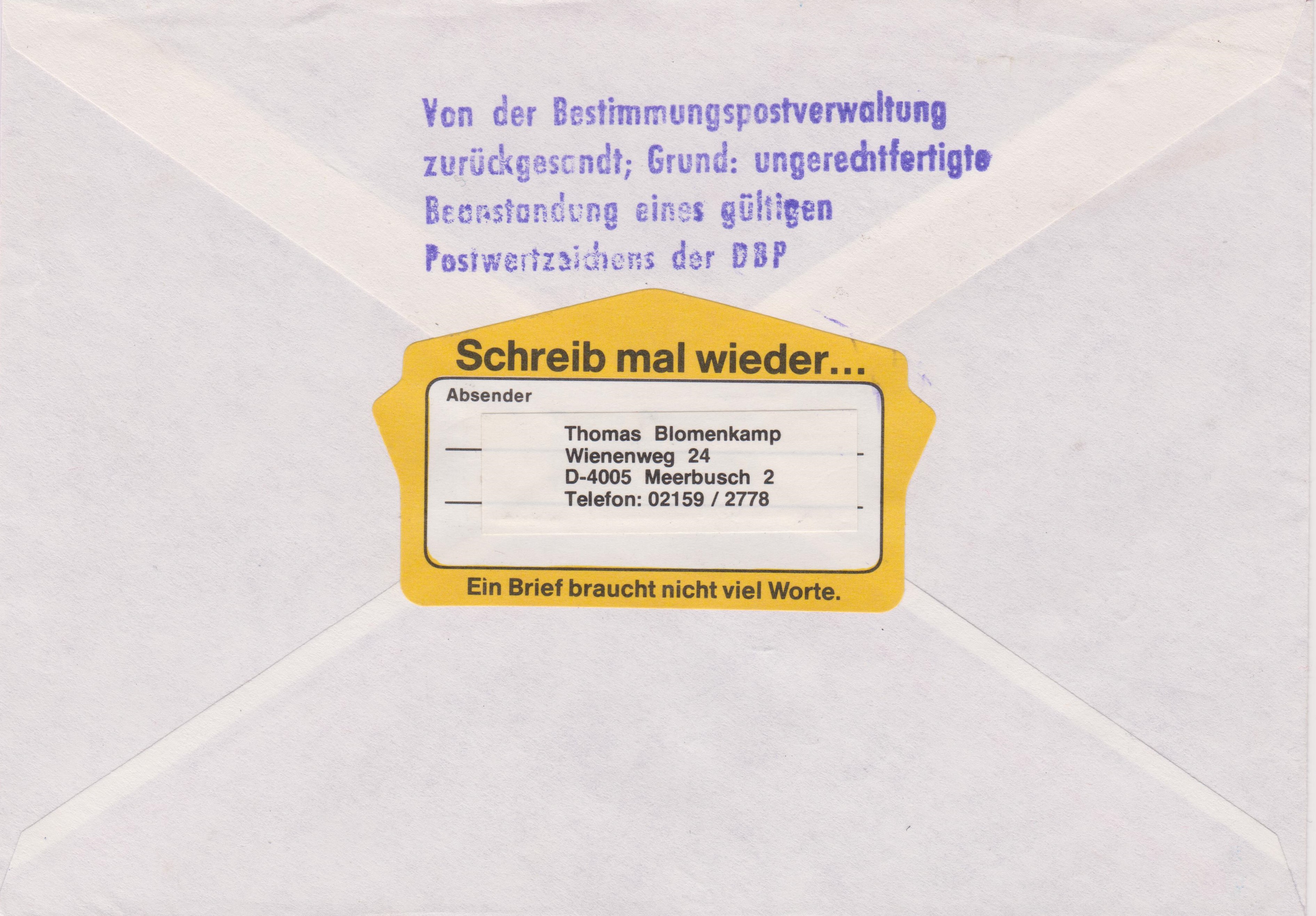 Dieser Beleg wurde von der DDR "zurück" gewiesen, weil die DDR die Bundesrepublik MiNr. 1287 nicht akzeptierte: