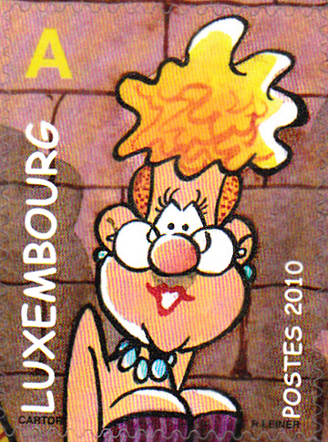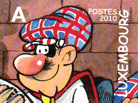 In Luxemburg erschienen 2010 in einem Block fünf selbstklebende Marken mit Figuren aus der Comicserie "Superjhemp". Hier die Marke (MiNr 1869) mit einer Abbildung des Hundes Bernie: