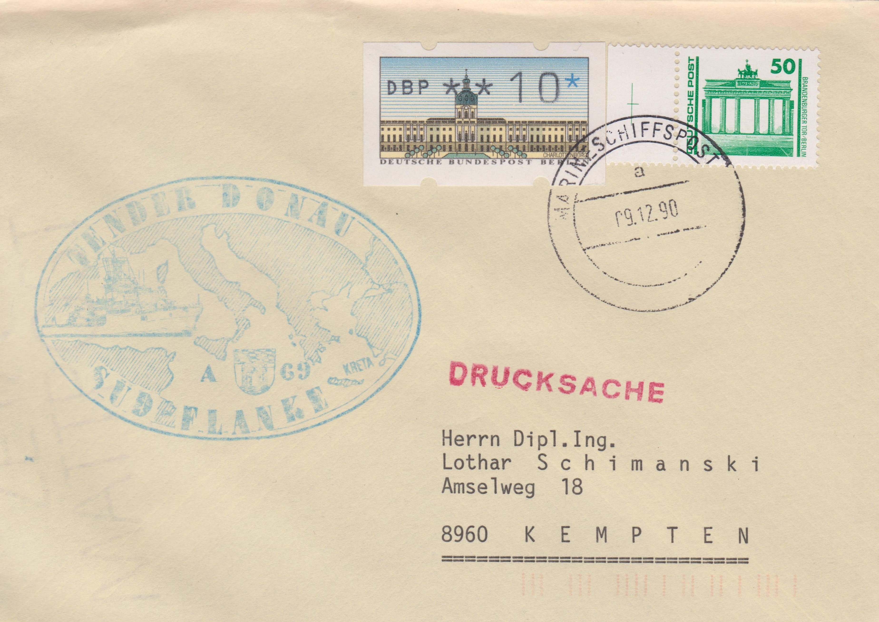 Hier die Wertstufe 50 Pf vom linken Bogenrand mit Passerkreuz sowie eine Berliner Automatenmarke der Wertstufe 10 Pf zur Abdeckung der Portostufe 60 Pf für eine Drucksache am 09.12.1990 per "MARINESCHIFFSPOST" vom Tender Donau nach 8960 Kempten gelaufen, mit entsprechender Kodierung: