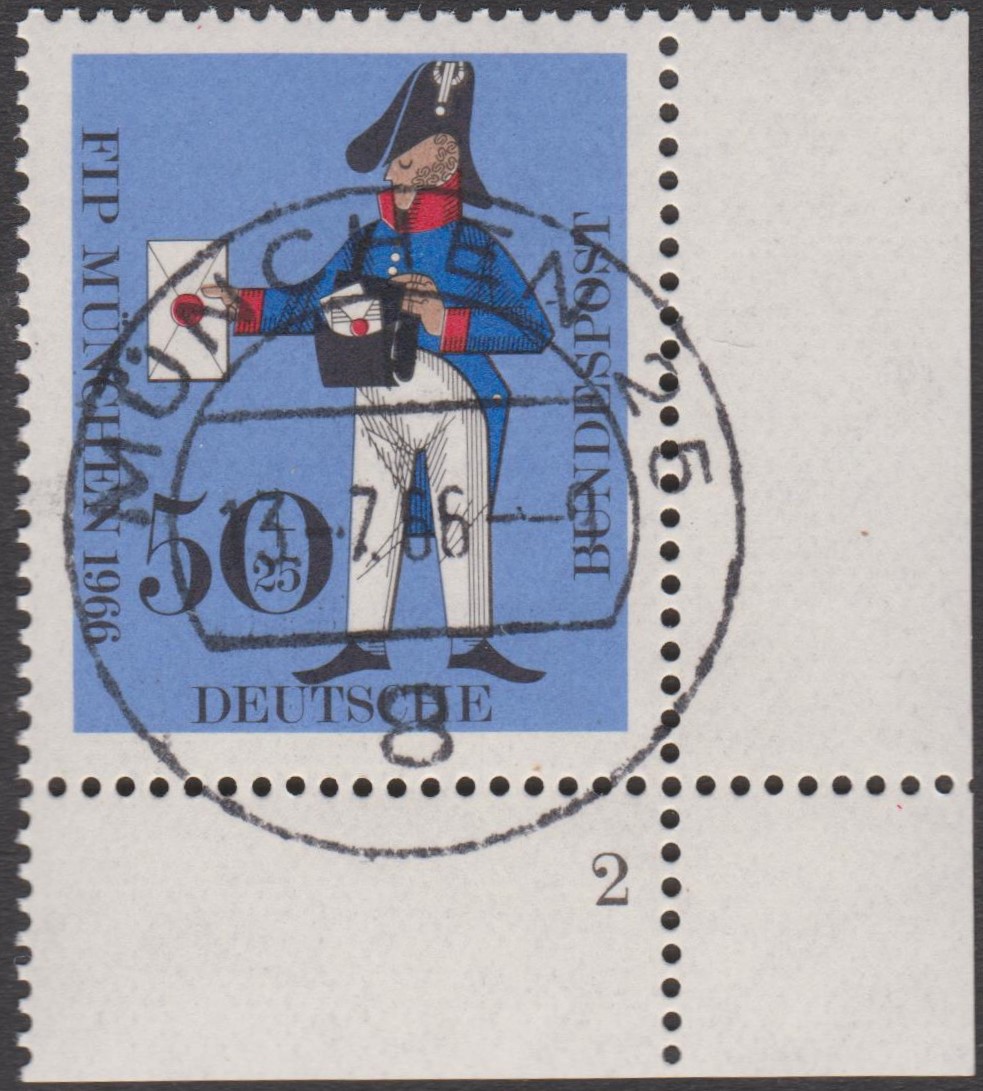 Hier eine Bund MiNr. 517 aus der rechten unteren Bogenecke mit Formnummer "2", gestempelt am 13.07.1966 (= Erstausgabetag) in MÜNCHEN 25: