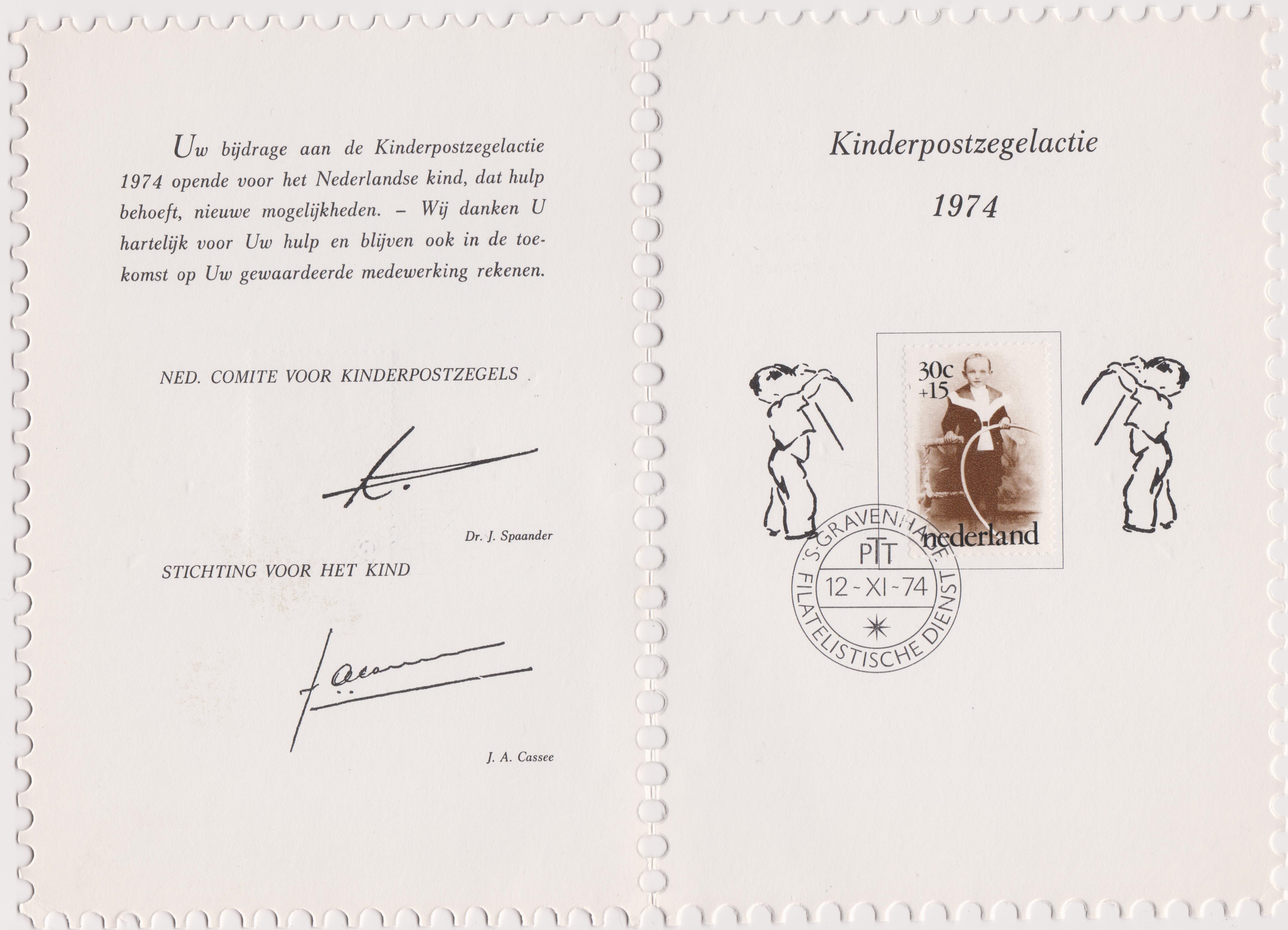 Die hier gezeigte Karte zur "Kinderpostzegelactie 1974" (= Kinderpostbriefmarkenaktion 1974) mit Niederlande MiNr. 1039, gestempelt am 12.11.1974 = Ersttag, hatte eine Auflage von 16.000 Stück und trägt die Nummer "15620".