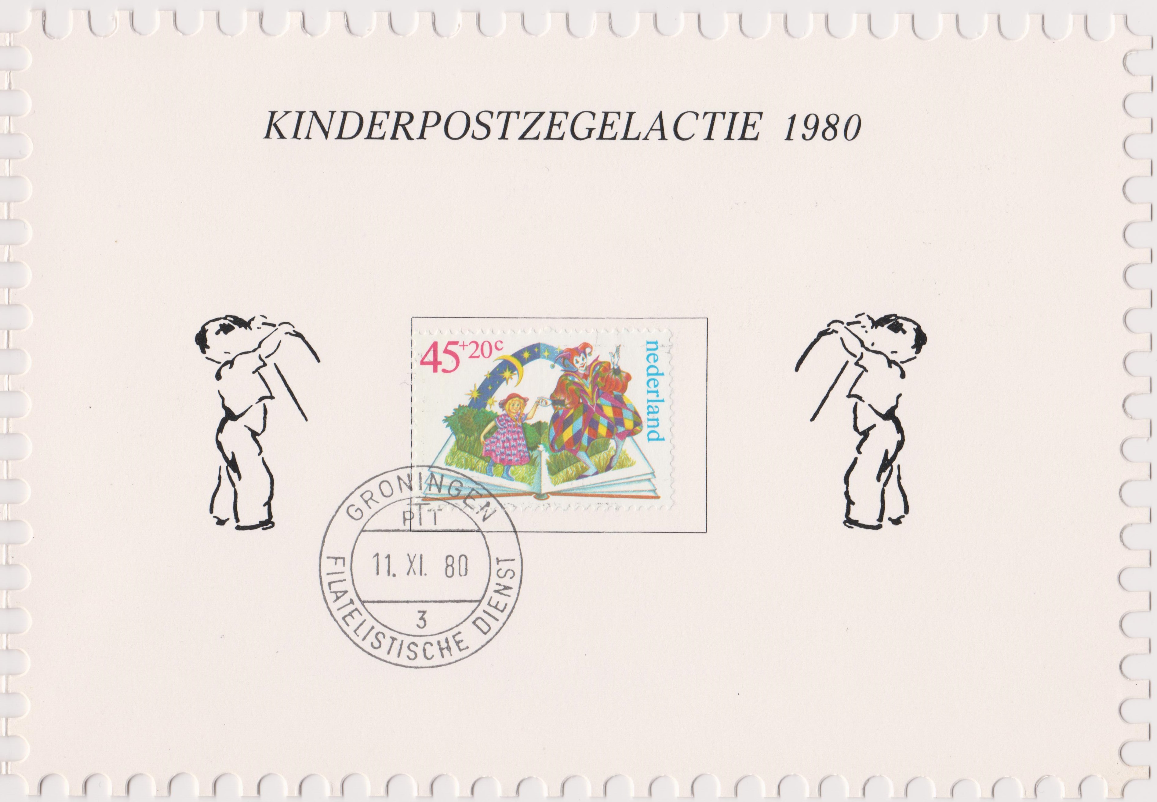 Die hier gezeigte Karte zur "Kinderpostzegelactie 1980" (= Kinderpostbriefmarkenaktion 1980) mit Niederlande MiNr. 1171, gestempelt am 11.11.1980 = Ersttag, hatte eine Auflage von 15.000 Stück und trägt die Nummer "001694":